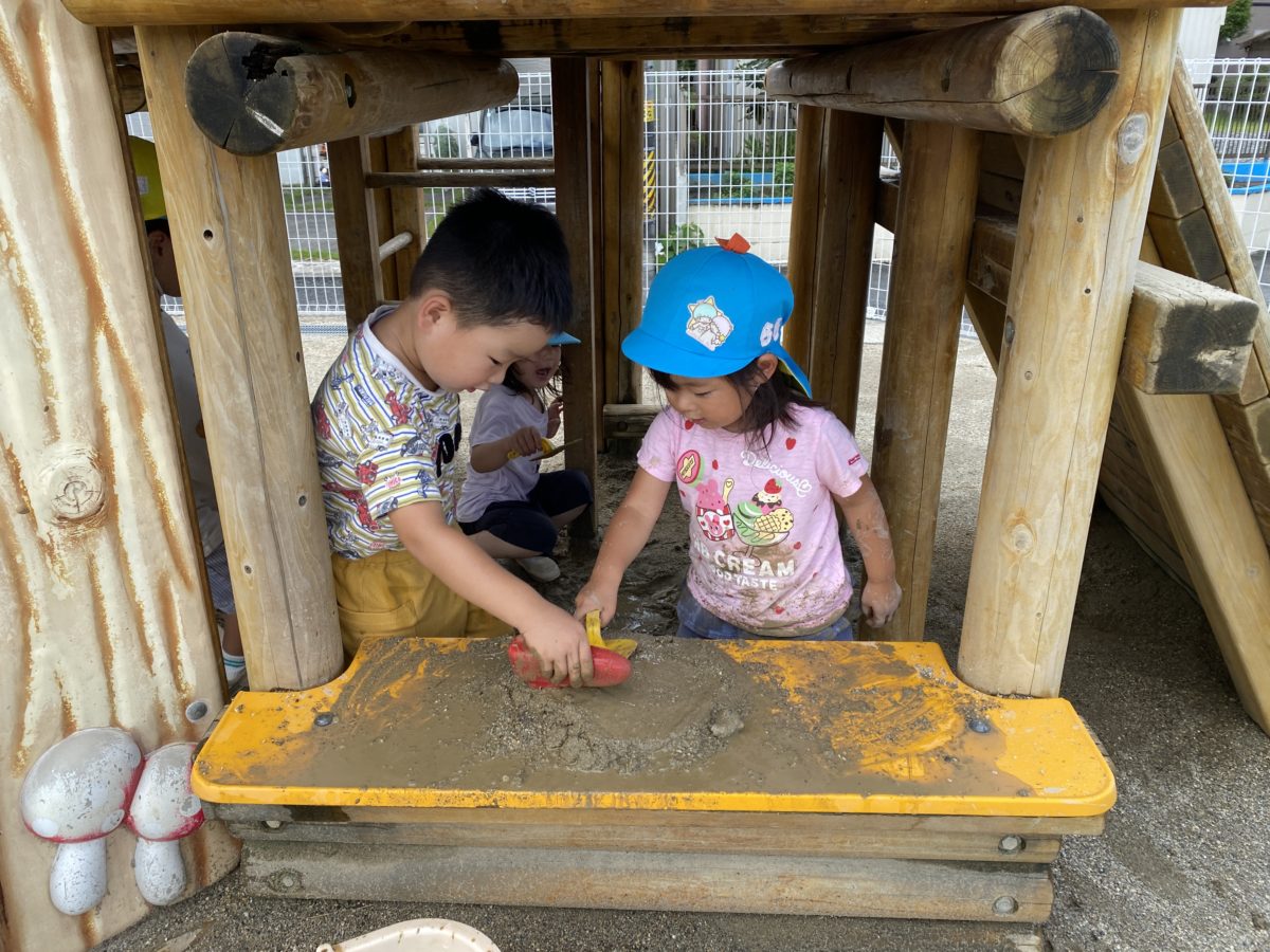 雨上がり特有の砂の感触を楽しみながら、お友だちとごっこ遊びが始まっていました。ケーキ作りを一緒に楽しんでいました。