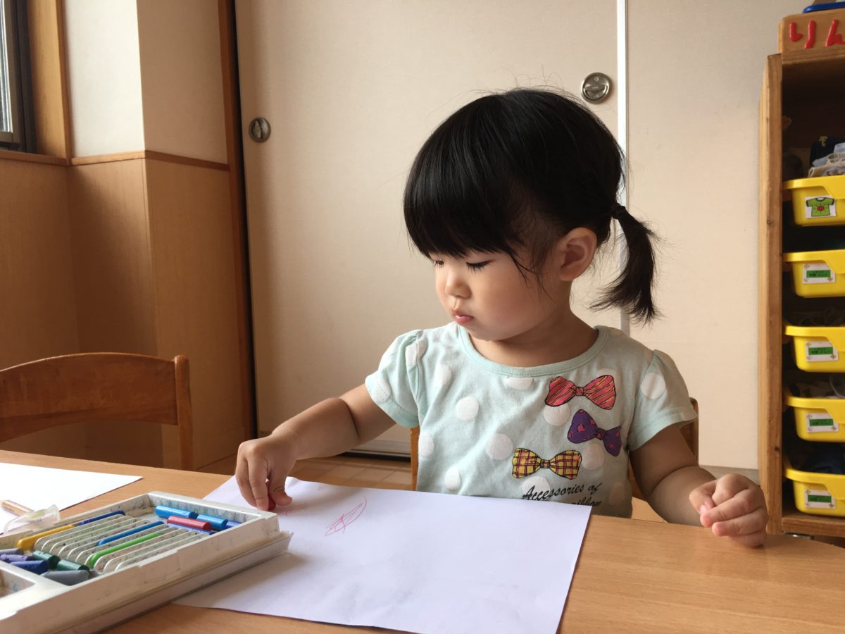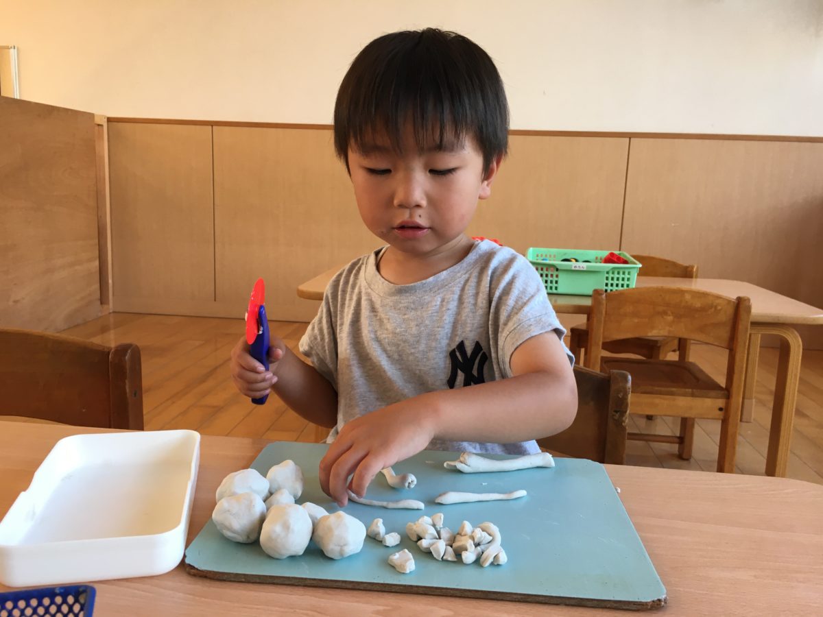 ソフトブロックや井型ブロックに夢中なお友だち。「しんかんせんつくるの」「じゃあぼくくるまつくる!」とお友だちと役割分担をしながら次々にブロックを組み合わせ完成したのは、車でも新幹線でもない特大ロボット!「ロボットになっちゃった!」ととっても大きなロボットの横には謎の建物まで。「みて!おっきいでしょ!」と机の上には大きな作品たちが沢山並んでいました。ブロック遊びを終えた後は「ねんどしたいの」と子どもたちからのリクエストから、粘土遊びができるよう準備してみることに。丸めたり細長く伸ばしたり。色々な形に粘土を変化させていくと・・・「みて!ぎょうざできた!」とどうやら餃子を作っていたようです!「ぼくもできたよ!」と一生懸命粘土で餃子の形を作りながら楽しんでいました。