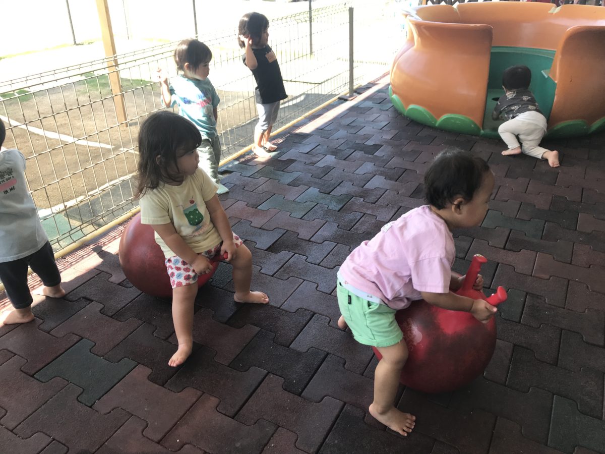園庭では水の入ったバケツを囲んで水の冷たさを感じると、「つめた!」「もう一回!」とお友だちとやり取りを楽しむ姿がありました。手に持っていた型に水を入れると、地面に水を撒いて「おかわり!」と何度も水を汲んで水遊びを楽しみ、それを見た周りのお友だちも次々に型を持ってきて水を汲んでは同じように水を撒いていました。