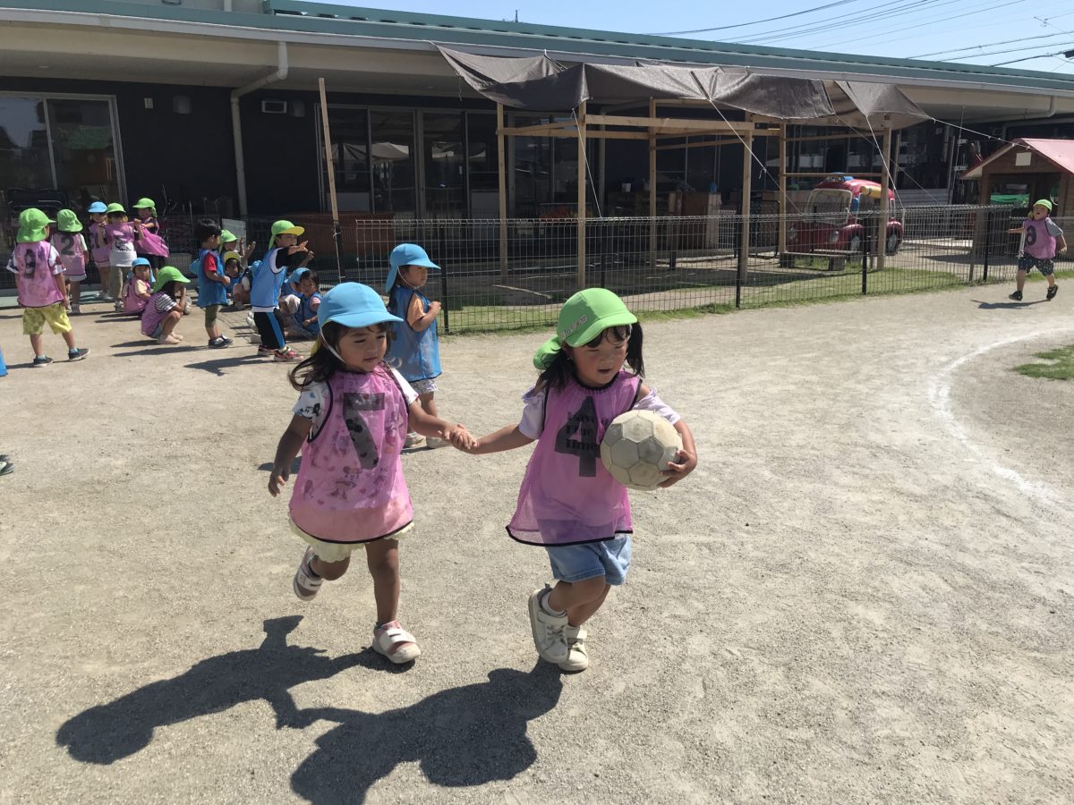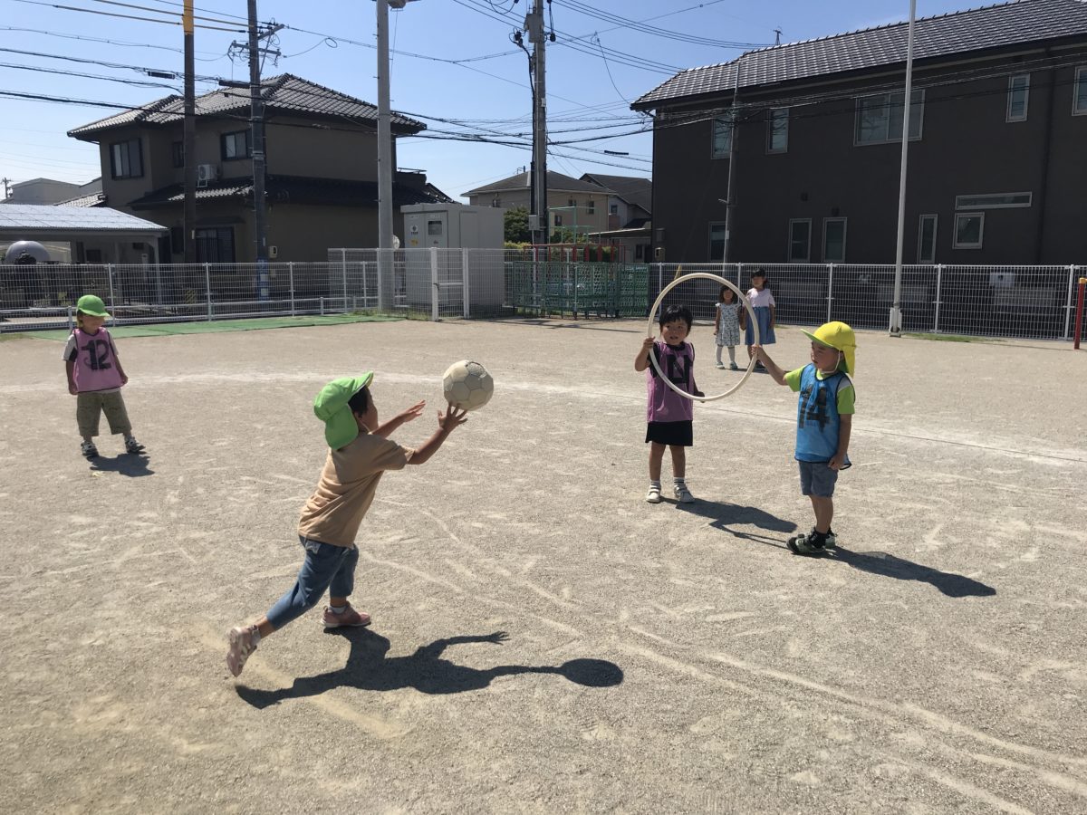 今日はボールとフラフープをバトンにしてばなな、さくらんぼ組のお友だちだけでリレーに挑戦!ばなな組のお友だちはめろん組さんの姿をよくみていたのか「〇ばんはここー!」「いっしょにはしる?」「つぎ〇ばんやでー!」と優しく声を掛ける姿が見られました。さくらんぼ組のお友だちも「こっち!こっち!」とバトンを持って走っている子に教えてあげたり、今までお友だちと一緒に走っていた子も頑張って一人で走ったりと少しずつ成長している様子が感じられました。また、バトン代わりにしていたフラフープとボールを使ってボール入れゲームが始まりました。「そっちでフラフープもってー!」「いくでー!」「えいっ!」とフラフープをゴールにして何度も挑戦していました。初めは近くで投げていましたが、「ここからでもはいるかも?!」とどんどん遠くへ離れたり「こうしたらどう?」「ひくいのできる?」「たかいのは?」とフラフープを持っているお友だちもゲームの難易度を工夫しながら楽しんでいました。