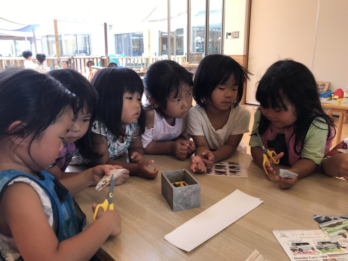 ワンピース作りなど折り紙に夢中のばなな組さん。 今日はハサミを使って・・「できた!はなび!」と切り紙を楽しんでいました。