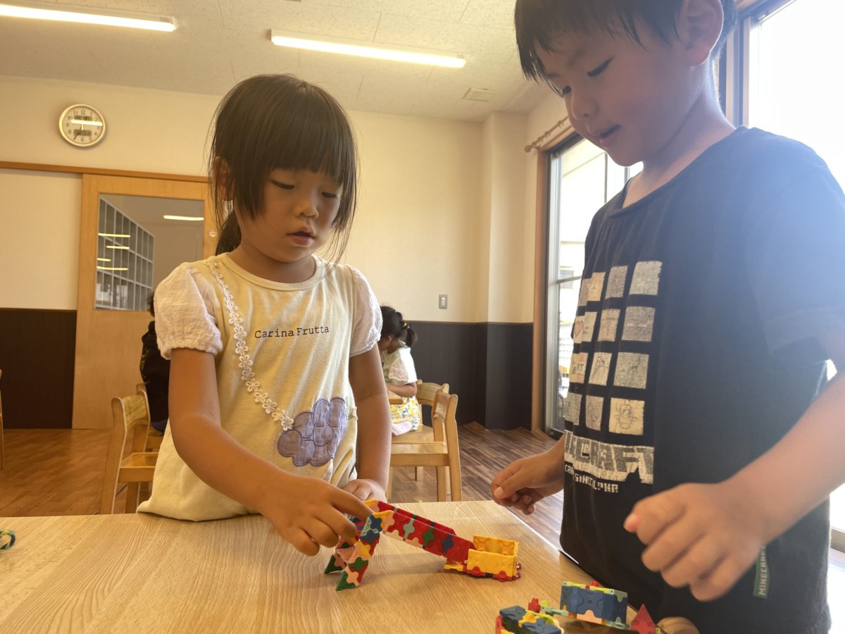 「みて!ほいくえんのプールみたい!」とラキューを器用に組み合わせているめろん組さん。