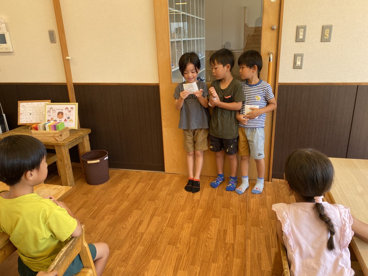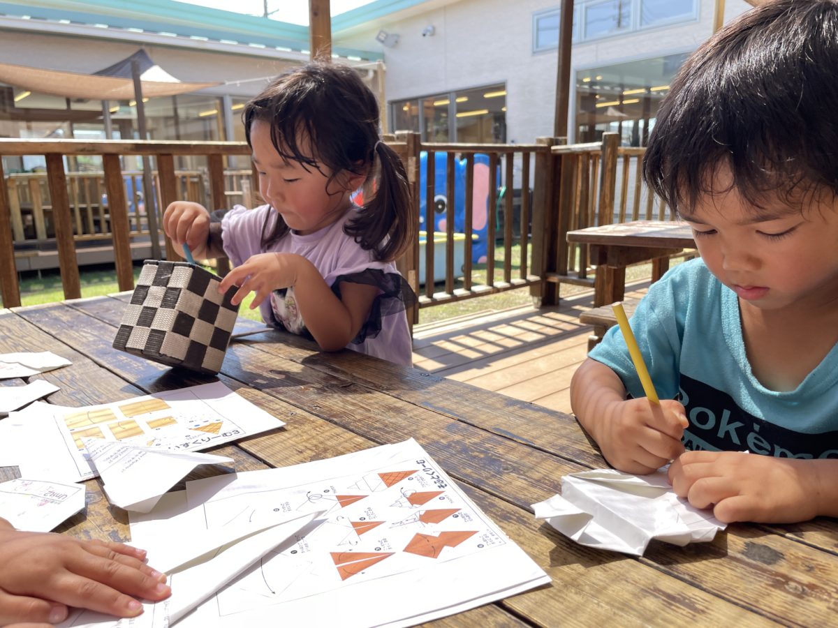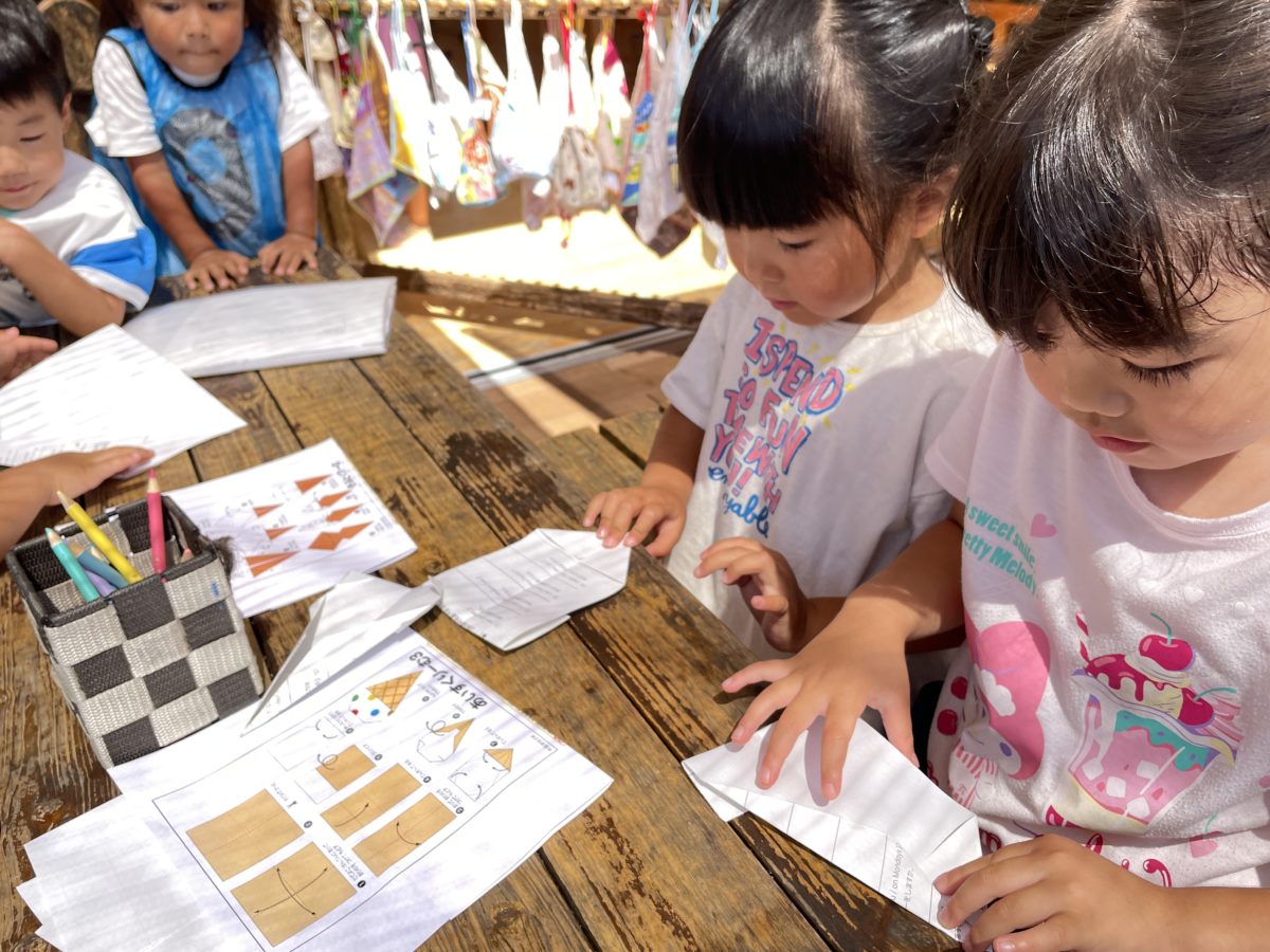 今日は園庭でいつもとは少し違うバトンでリレーを行いました。三角コーンと丸いコーンをアイスクリームバトンを作り「きょうはアイスクリームはいたつりれーだね!」と話していました。すると…思ったよりも上の丸いコーンが落ちてしまい「あいすとけまくりやーん!!」と「がんばってはいたつしよー!」チームで声を掛け合う子どもたちの姿もありました。そしてお部屋では「おりがみでさ、ようふくやじゃなくてきょうはたべものがいい」と話している声があり、様々な食べ物の図を用意しておくと「きょうはあいすくりーむおってみる!」と暑い日に食べたいアイスクリーム!!を選んだようでした。子どもたちは図を見ながら「さいしょはこっちからおって…」とじっくりと考えたり「つぎってこうやとおもう?」とお友だちと相談しながら折っている姿もありました。「できたー!あいすくりーむ。」とみんなで考えあい完成すると「いつもみたいにぬったりしたいな。」と色鉛筆を使って自分が食べたい味のアイスクリームを塗って作っていました。「ぼくはそふとくりーむやけど、にじいろにしたん♪」と子どもたちのイメージやアイデアが溢れるアイスクリームがたくさんできていました。作っている途中でも「アイスたべたくなってきたなぁ~」「なんのあいすたべたい?」「ちょこあいすがいいなー。」とアイス話で盛り上がっていた子どもたちでした。めろん組さんは積み木を三角に積んでいき、三角形がいくつあるか考えたり、今日はお泊り保育で記憶に残っていることをグループで書き出し、みんなの前で発表しました。最初は恥ずかしさなどもあったようですが、次第に自信を持って発表する姿がありました。