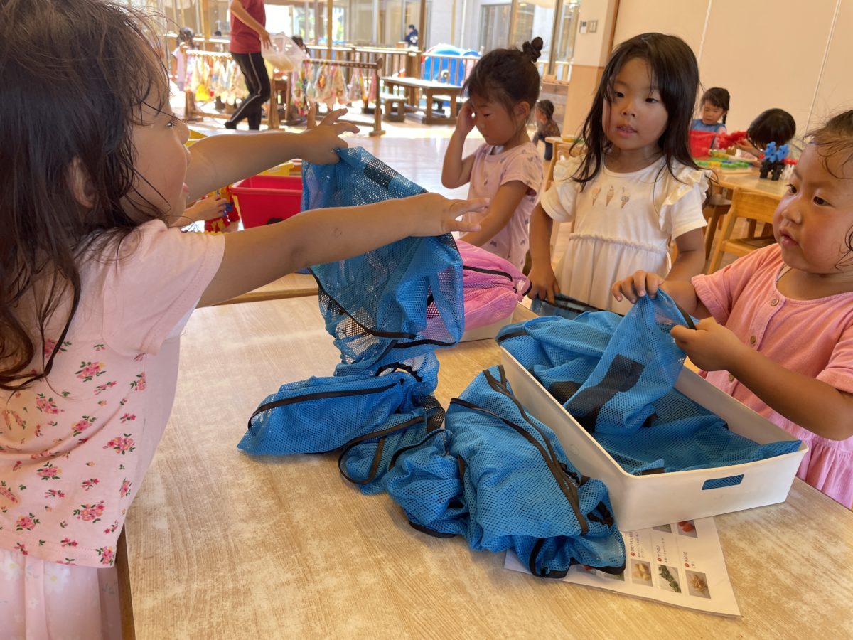 みてー!わたしきれいにたためるようになったでしょ!と自分がきれいに畳めたビブスをお友だちに見せるさくらんぼ組さん。 じょうずに畳めるようになって嬉しそうです!!