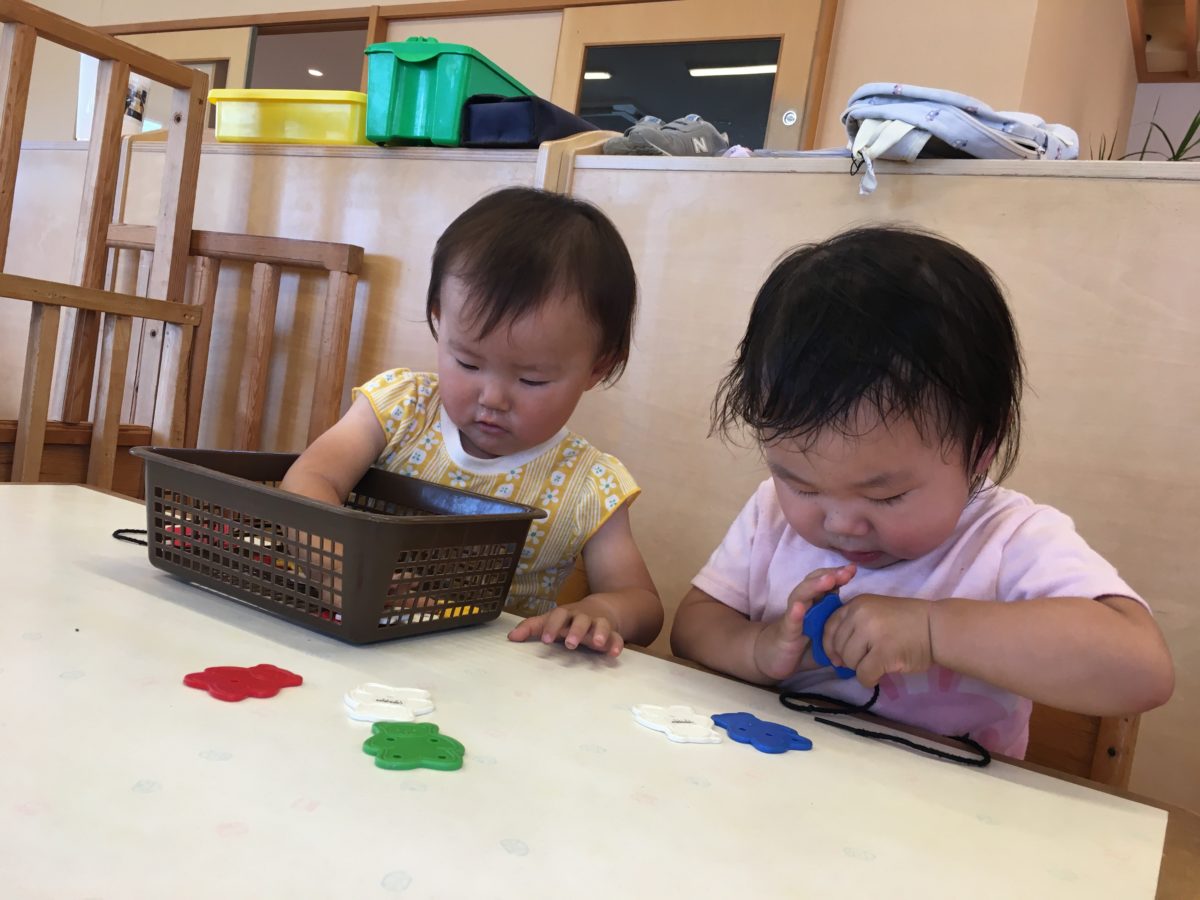 前回紐通しに夢中な子どもたちの様子から、今日も準備してみることに。紐通しが入っている袋を準備していると早速「これなに?」と椅子に座り始めていました。紐を手に取ると「やるー!」ととっても嬉しそうです。小さな穴に紐を通そうと真剣な表情。「うーん」と苦戦しながらも一つ穴に通すことができると「できたー!」と何度も紐通しに挑戦していました。