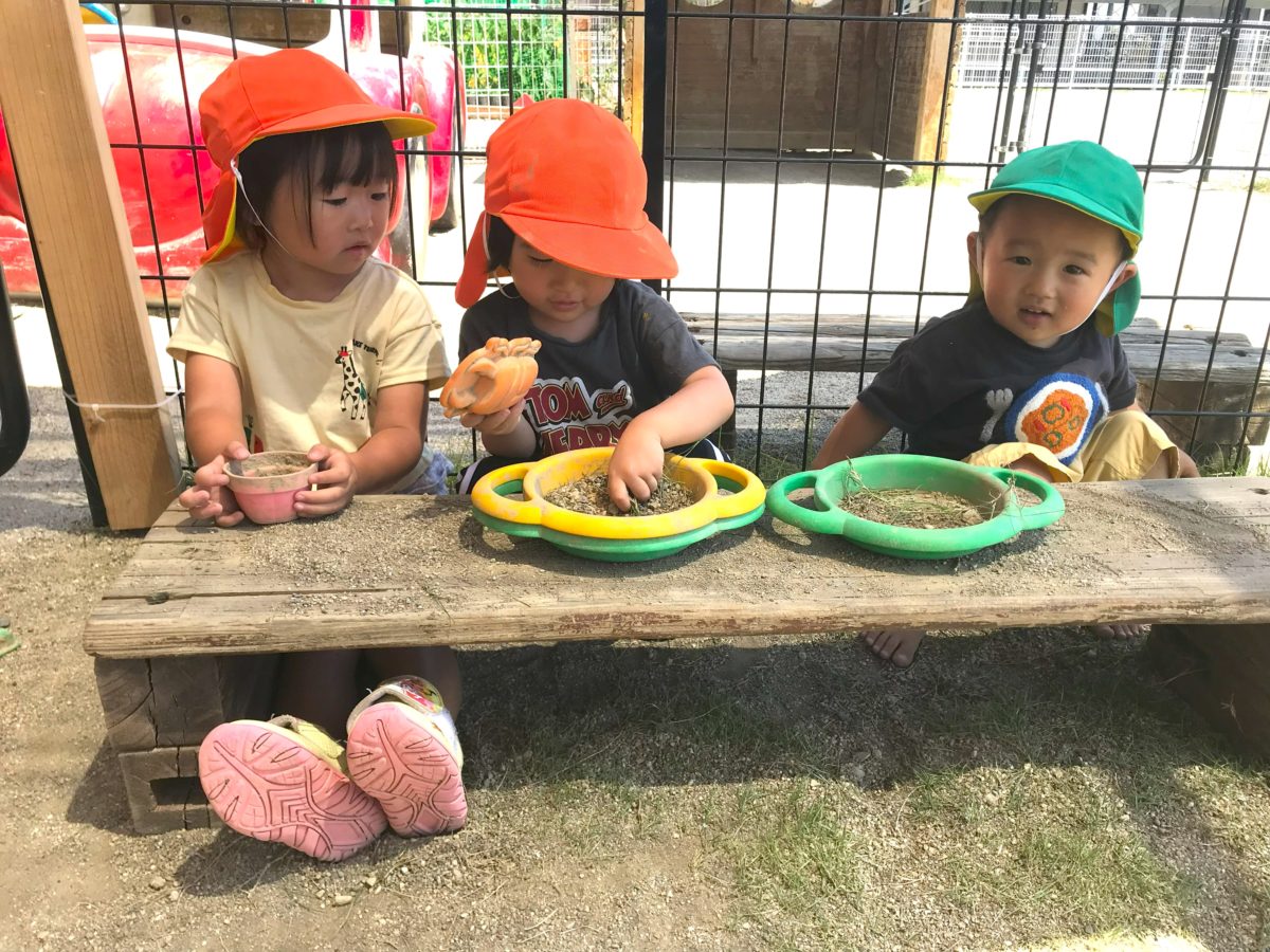 一方園庭では、泥遊びを楽しむ子どもたち。砂に水を少し足すと手でバシャバシャとさせてみたり、泥をかき集めて固めてみたり。中には、カップに水を掬って「こおりつくるの」とこんな声も聞こえてきました!「ぼくこれつくってるの」「〇〇くんはだんごつくる!」とお友だちと泥遊びをするうちに気づけば団子作りへと遊びは展開。「だんごどうやってつくるの?」「こうじゃない?」と砂をぎゅっと握りますが思うように作れない団子に苦戦中。すぐに崩れてしまう団子に「あ~こわれた!」と言いながらも何度も何度もぎゅっと握りながら団子作りを楽しむ子どもたちでした。