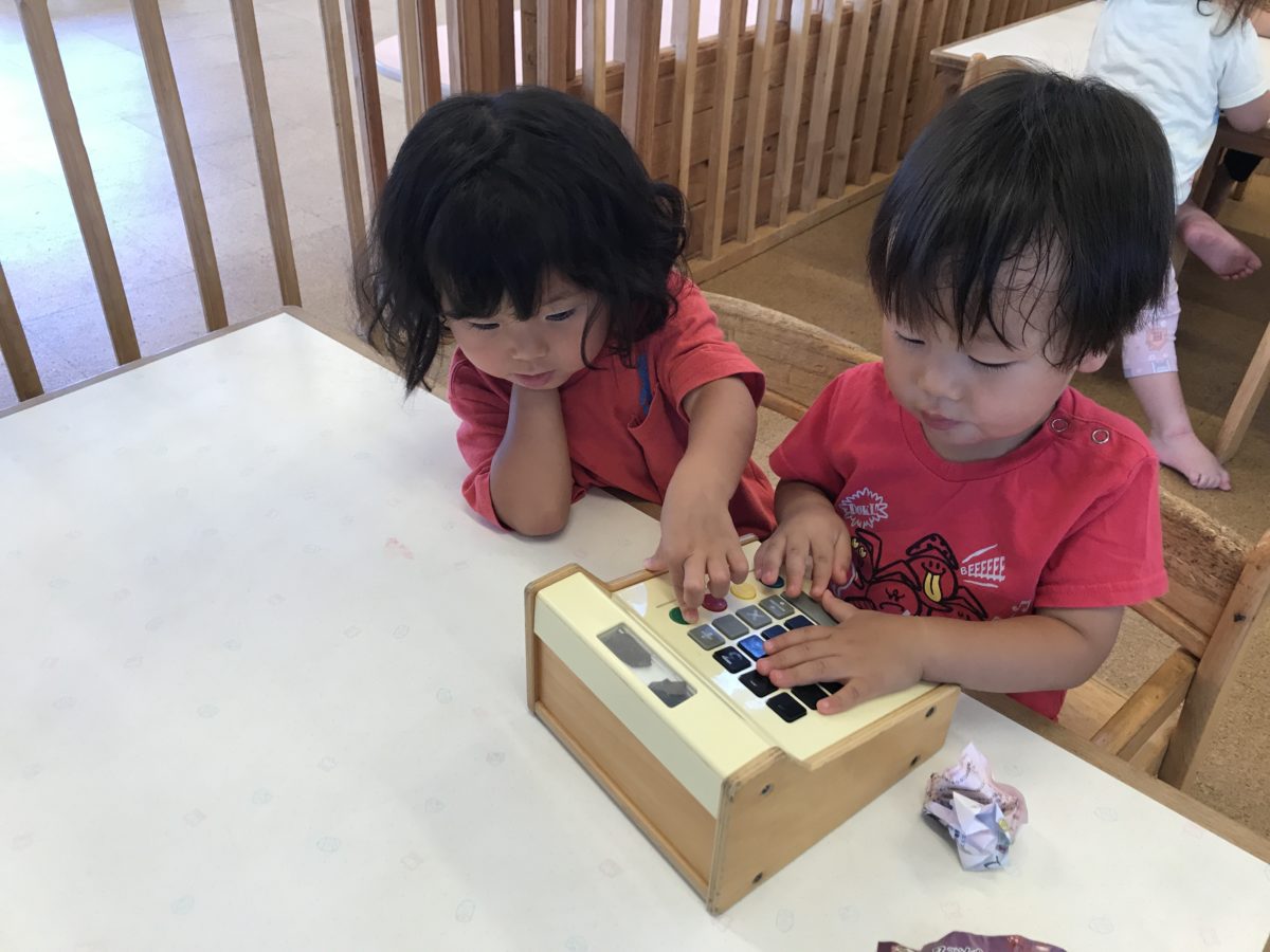 いちご組さんはレジのおもちゃに気が付くと、「お店のだね~」「ポチッ!」とボタンを押して楽しむと、「いらっしゃいませ~」「これちょーだい」「あげる!」とお店やさんごっこが始まっていました。
