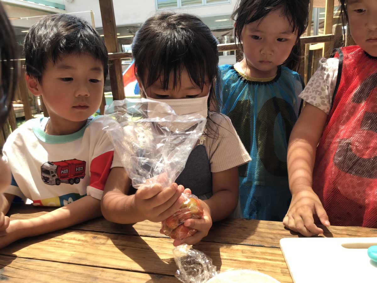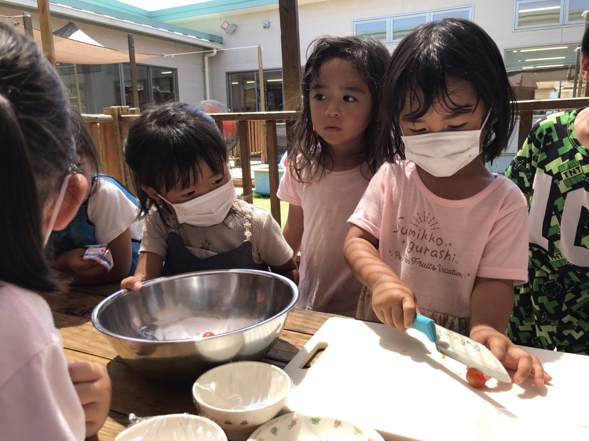 トマトのクッキングでは、さくらんぼ組のお友だちも包丁に挑戦!周りにいたばなな組のお友だちが「こうやってきるんやで!」「はんたいのては、ねこのて!」と教えてあげる姿があり、ばなな組のお友だちもトマトの中身がでてこないように、ナスやきゅうりなどいつものクッキングよりも慎重に扱う様子が見られました。