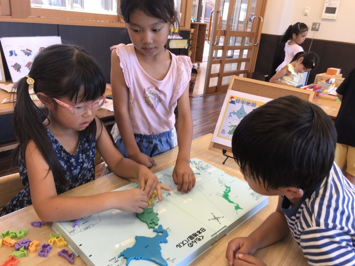 都道府県パズルに夢中のめろん組さん。「おっきいのはほっかいどう!」「おきなわけんいったことあるでー!」と会話が盛り上がっている中で「みえけんってどこ?」と疑問の声が聞こえてきました。「このへんかな?」「こんなかたちじゃなかった?」と思い出しながらパズルの文字を見たり日本地図の資料と見比べたりとお友だちと協力し合いながら三重県探しに挑戦していました。