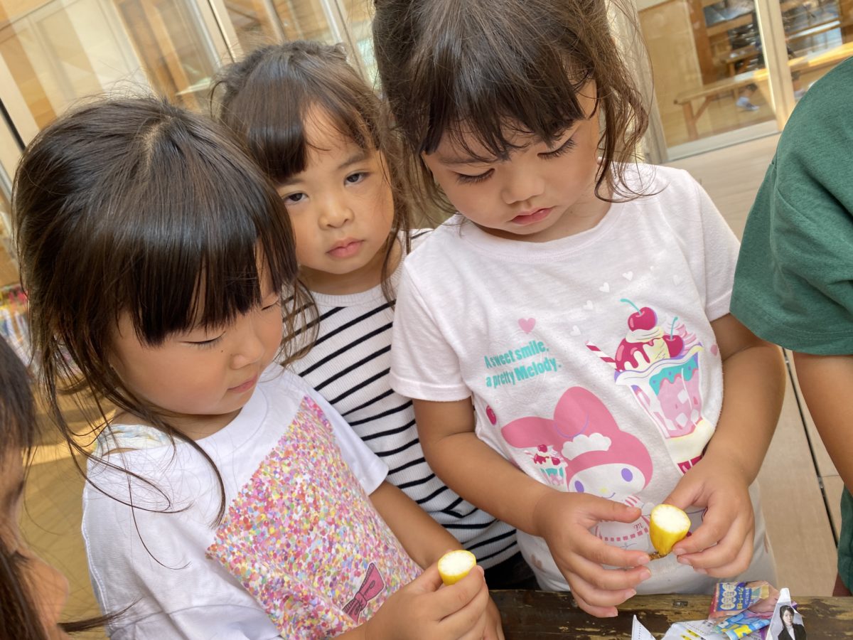 今日は朝かっこいい消防車が保育園の駐車場に到着するとびっくり!!「しょうぼうしゃ、かっこいいー!!」とドキドキわくわくしている声であふれていました。消防車を見学させてもらうと「これはなんだろう?」と火事をイメージしながら生き生きと質問して、ますますかっこいい!!と消防車を夢中で見ていました。また火を消すための消火ホースを持たせてもらう体験にも挑戦しました。ホースの重たさにびっくり!!「こんなにおもたいの!?」と一生懸命にホースを抱えながら、消防士さんとの関わりも楽しんでいました。また園庭では残念ながら枯れてしまった大きなとうもろこしを抜きました。どうしたら抜けるんだろう!?と根元をスコップで掘りながら挑戦してみるさくらんぼ組さんの姿がありました。昨日見つけた黄色いきゅうりを切ってみると中がすごく白くてびっくり!!「えっしろいの!?」とイメージしていた色とは違い、「でもきゅうりのにおい!」と香りをかいで確かめていました。なすときゅうりのクッキングでは、「みそもさとうもしょうゆもぜーんぶいれてみたい!」との味付けのリクエストから細切りと輪切りで区別して切りながらクッキングを楽しみました。二種類のお野菜が入っても好きな調味料が全部入ってもおいしく、「なす、たべれるようになった!!」とも話しながらお友だちと一緒においしく食べていました。