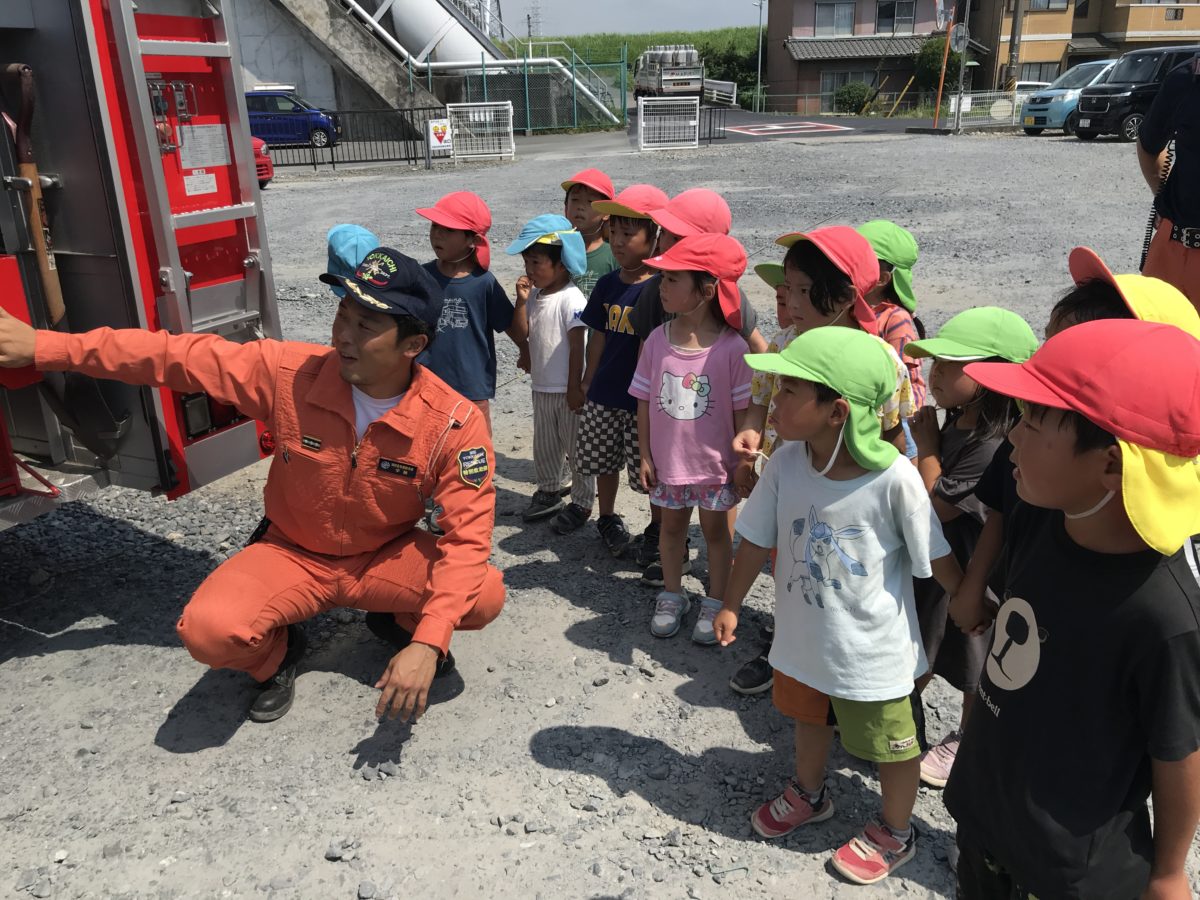 今日は消防車が保育園に到着すると「しょうぼうしゃがきたよ!!」とドキドキわくわくがいっぱいで見学させていただきました。消火ホースを持たせてもらうと重さにびっくり!!していました。