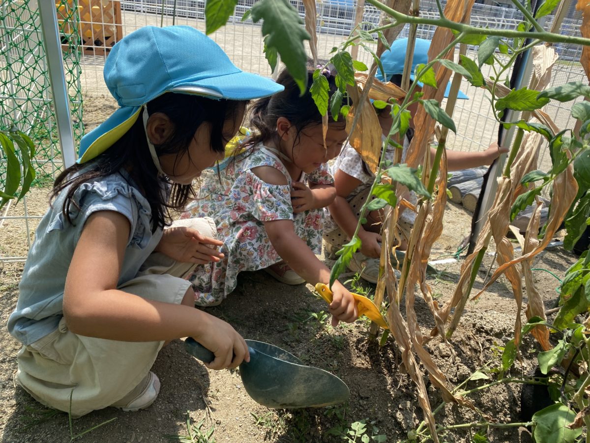 残念ながら畑で枯れてしまったとうもろこしを抜いて整理しました。「なかなかぬけないよー!!」と根元を掘って頑張っていました。