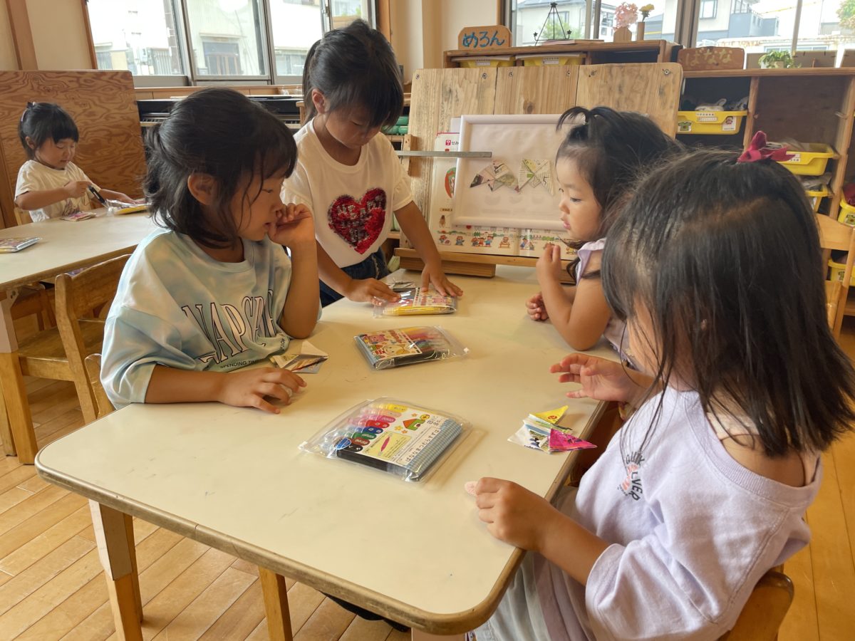 まだまだ蝉ブームの子ども達。今日は折り紙でセミを作ってました。