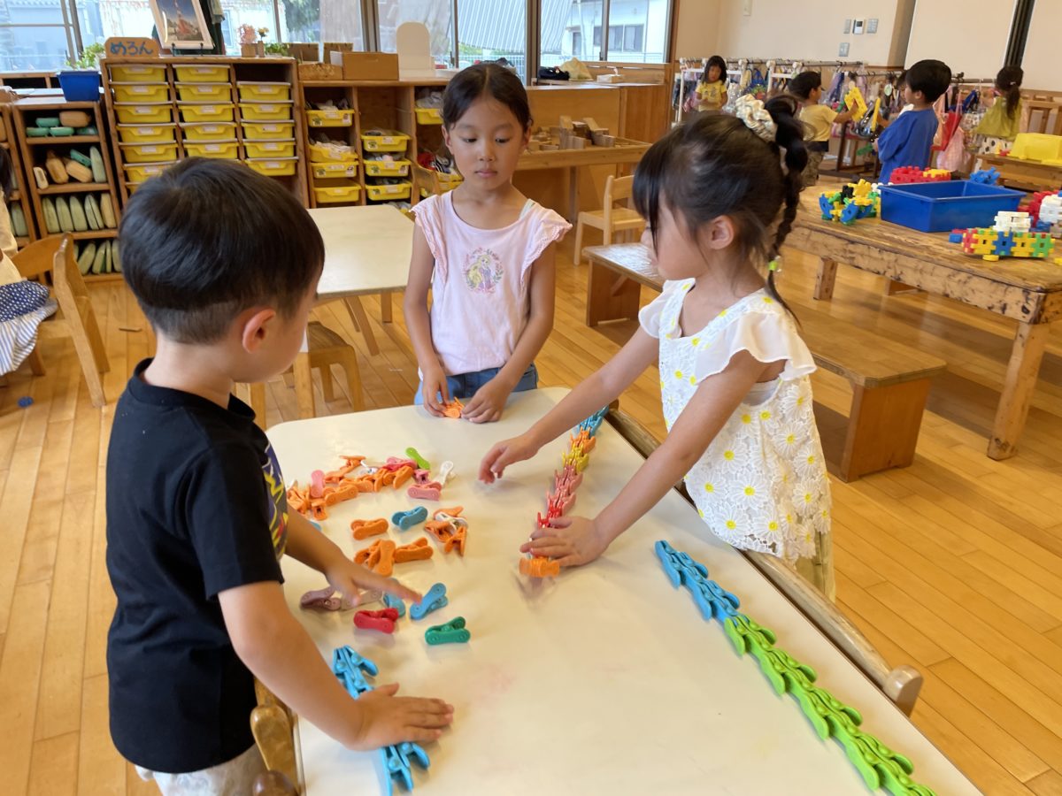 登園後にお友だちと一緒に長く長く繋げたクリップの玩具。「絶対先生より大きいで!」と嬉しそうに見せてくれました