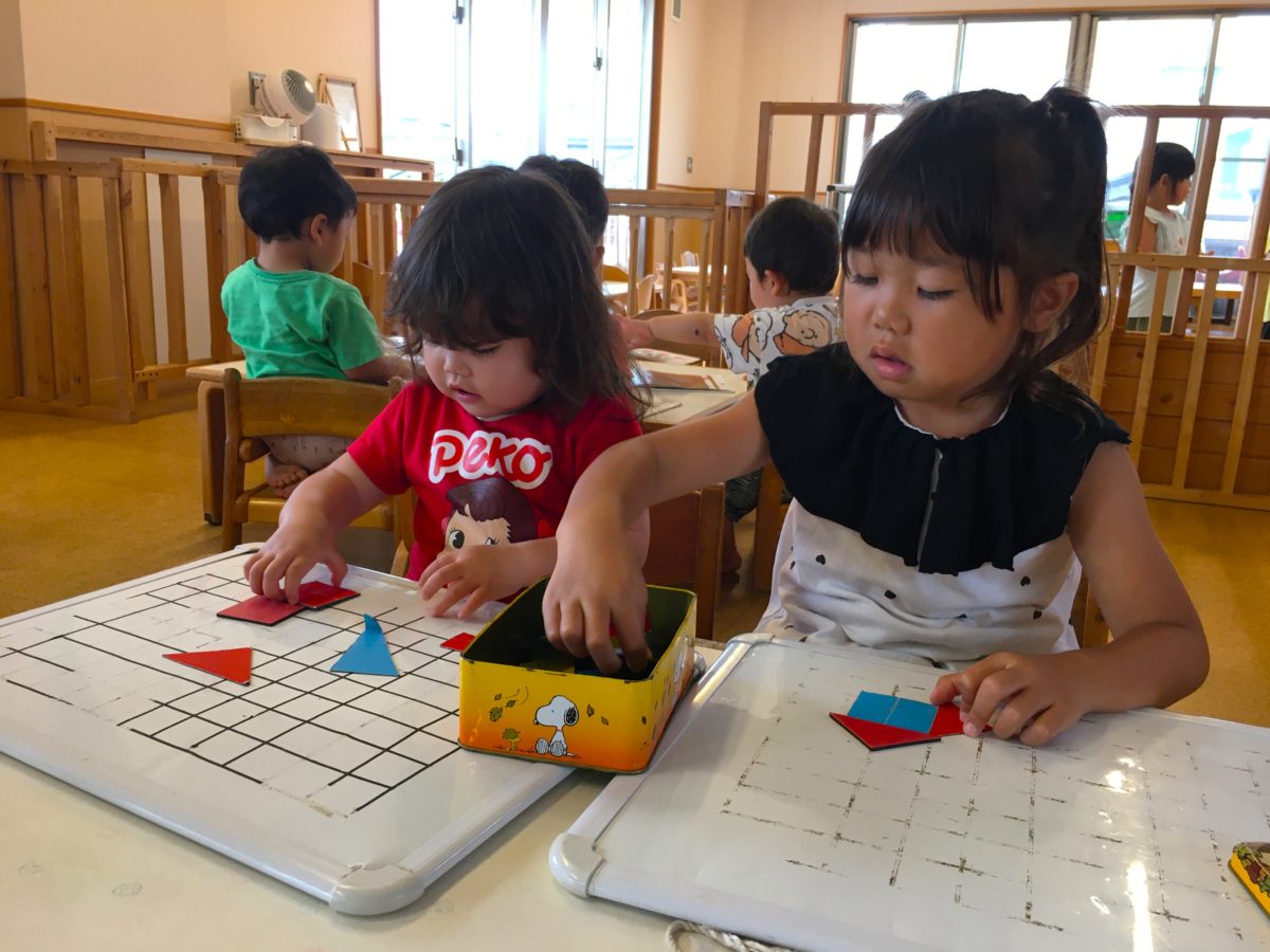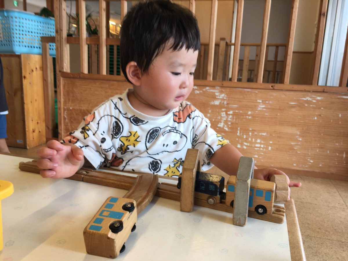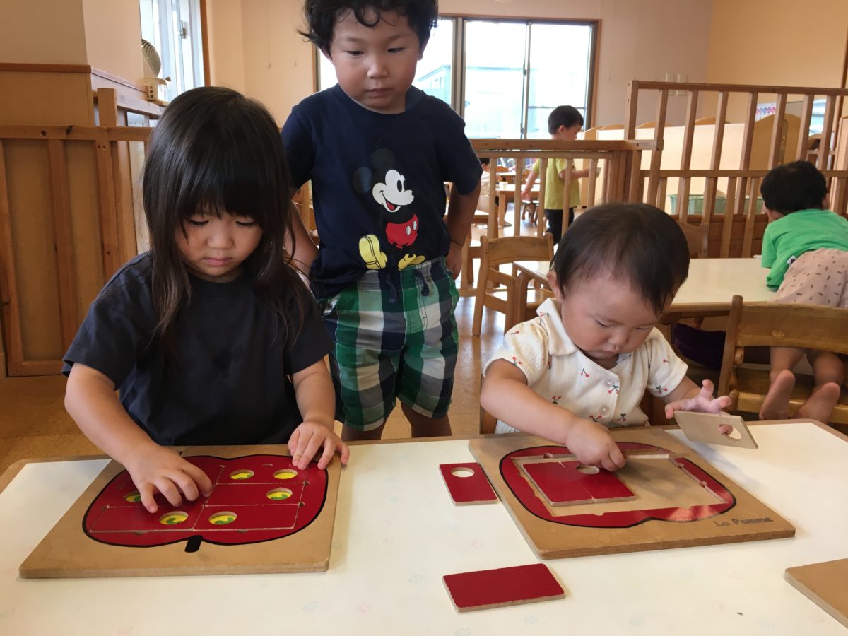 一方別の場所では、カレンダーと睨めっこ中のお友だち。「いち!に!さん!」と数を数えていました。こっそり数字が書かれた木の札を置いてみると・・・「これいっしょだよ!」と早速同じ数字を発見!「みて!2がいっぱい!」「これもこれも2だよ」と同じ数字を探すお友だちの姿も。少し難しい二桁の数字も「うーんないね」「これちがう?」とお友だちと相談し合いながら一生懸命数字を探していました。「これだ!」と無事見つかると「いっしょだね~」ととっても嬉しそうでしたよ。