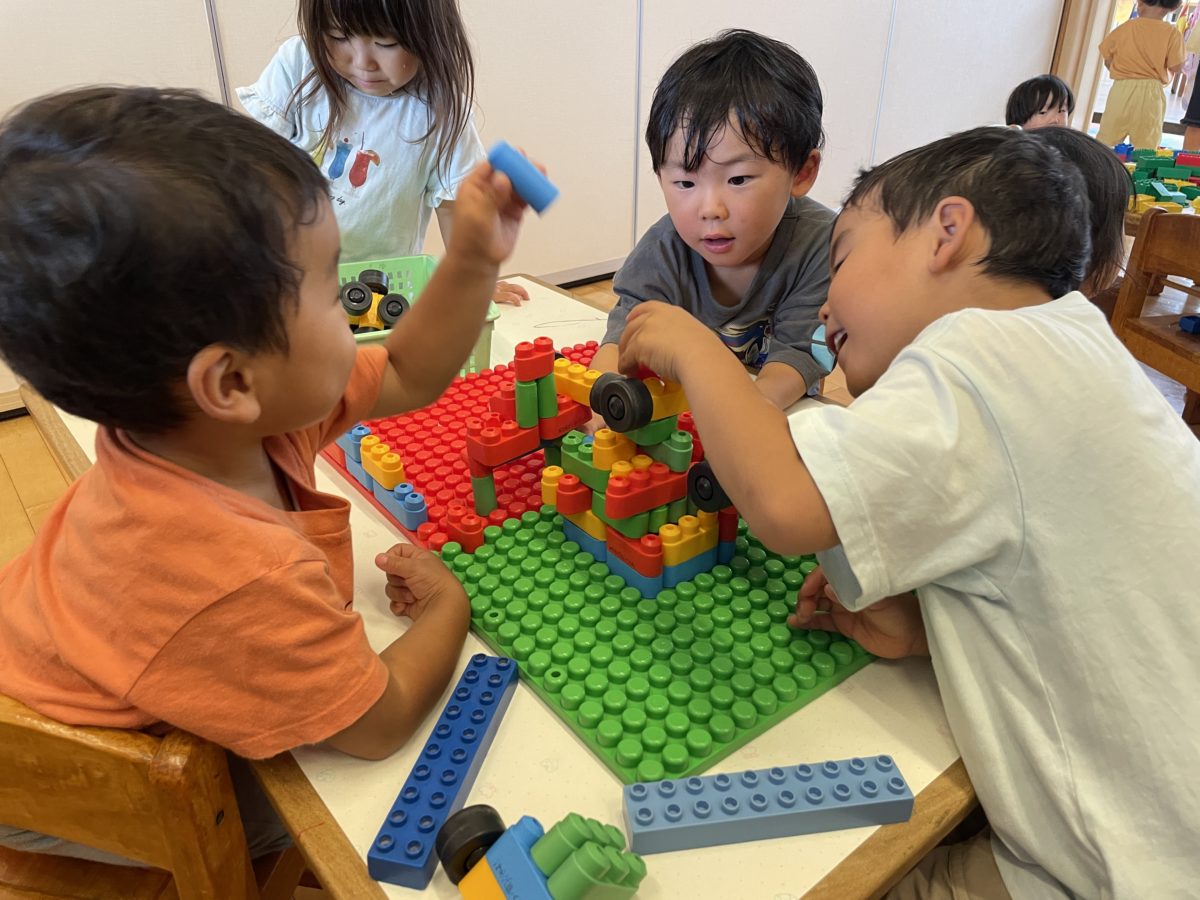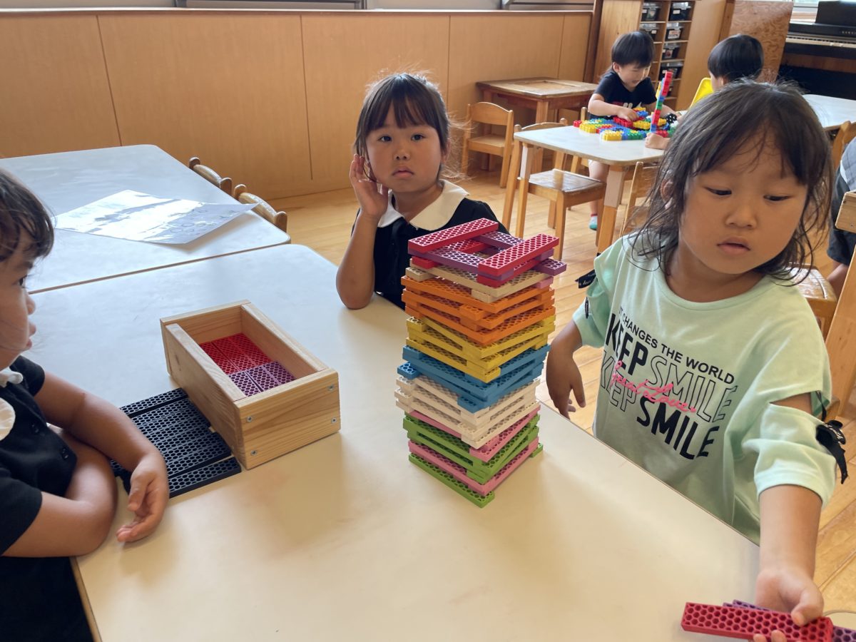 木のブロックを積みんでました。自分の中で色の組み合わせや順番が決まっているようで、こだわりを持って組み立ててました。