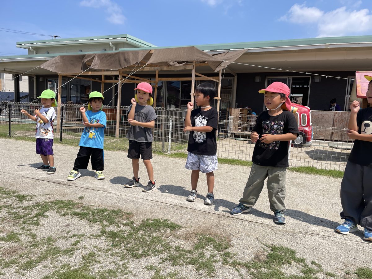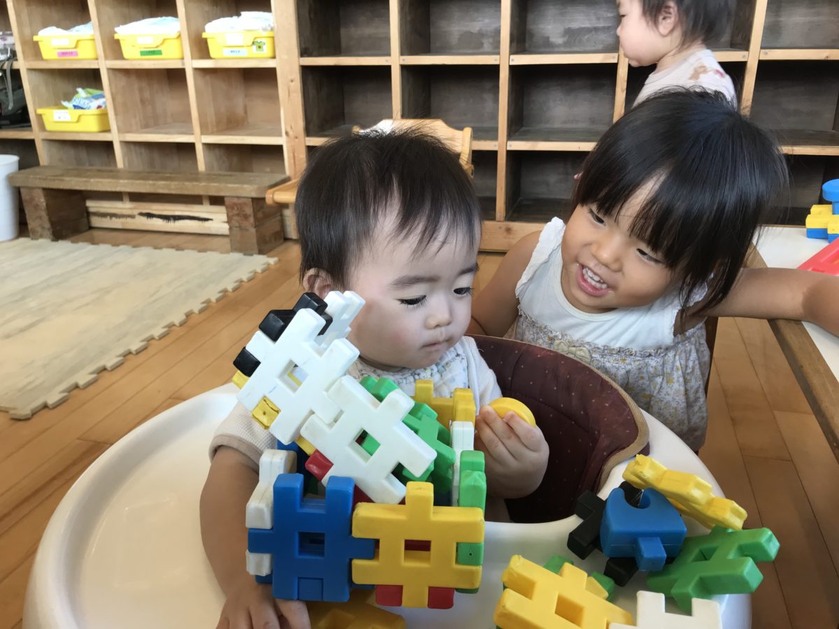 ハンバーガーのメニュー表を子どもたちが見つけると、ブロックを使ってオリジナルのハンバーガー作りが始まりました。赤や緑のブロックをトマトやレタスに例えてそれらを挟み、「ハンバーガーできた!」と嬉しそうに見せてくれる姿がありました。また、できたハンバーガーをお友だちに渡し、「味はどうですか?」「美味しいです!」などと会話を楽しむ姿も見られました。乗り物のカードに夢中のりんご組さん。救急車や消防車などのカードをお友だちと見せ合いながら「これなんだ?」「せいかい!」とクイズをして楽しむ姿が見られました。また、知らない乗り物が出てきたときは、「これはピーポーピーポーだよ」などと教えてくれるお友だちもいて、より一層カード遊びで盛り上がっていました。さらにすいか組のお友だちとも一緒に遊ぼうとおもちゃを渡してくれるりんご組さんの姿もあり、少しずつお兄さん、お姉さんになるという意識が芽生えてきたのかなと感じます。園庭ではめろん組さんがトンボを見つけ、捕まえようと必死でした。たもを持って走り回る姿や止まっているトンボには静かに近寄って取ろうとする姿もありました。