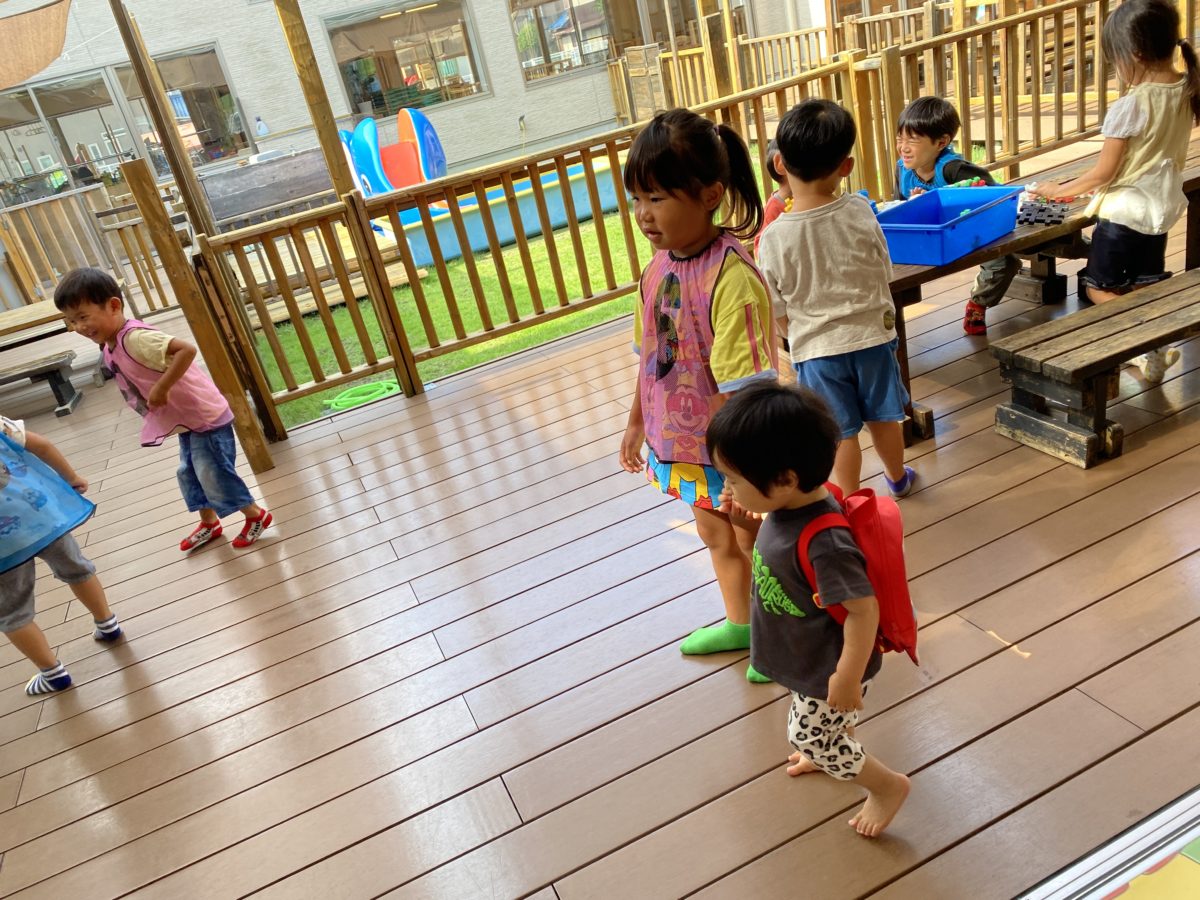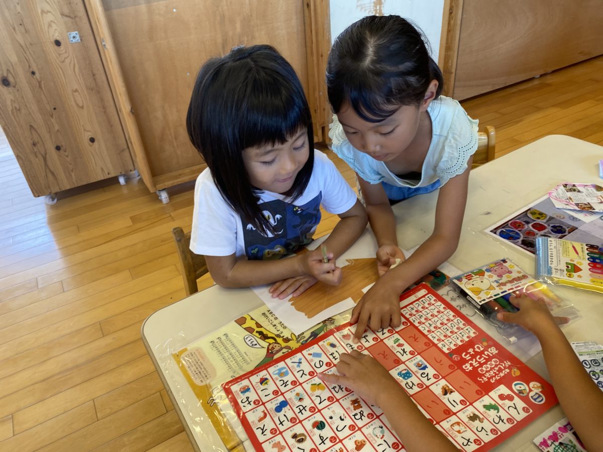 昨日はハチの資料に興味を示して、「はち!!」と危険なことも理解しながらお友だちと話す姿があったので、今日ははちの「巣」の資料を用意しました。「はち!!」と驚きながらも巣ということにすぐに気づき「はちのす!!」と興奮気味にお友だちと一緒に見ていました。たくさんの穴がある巣だけでなく大きな巣に穴が一つ!という巣もあることにびっくり!!「こんなのもある!」と驚いていました。巣とハチを見比べながら、いくつかの種類があることにも気付いていました。お部屋であやとりやお絵描き、積み木などいくつかの遊びのコーナーと共に約束事の看板があることに気付き、めろん組さんも作ってみようとあいうえお表を見ながら文字を書いていました。「おもちゃをなげるのやめて?」「たいせつに?」「いどうしないで、なくなっちゃう!とか?」と書く内容を考えたり、「どこにはる?」と貼る場所を考えていました。「なんてかいてあるかわかる?」と書いてあることをさくらんぼ組さんに知らせる姿もありました。
