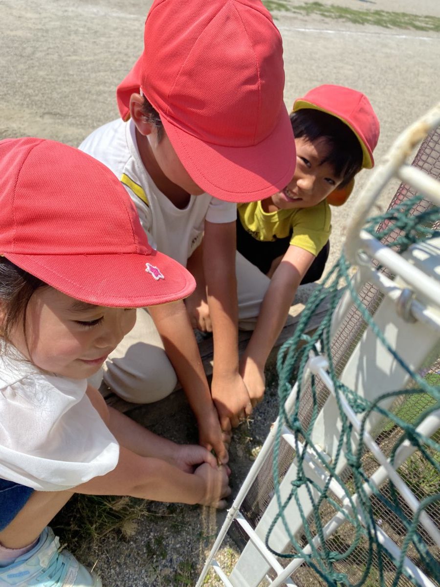 園庭の草抜きに挑戦中!!「うんとこしょ、どっこいしょ!!」「かたい!!」と予想より草が硬いことに驚いていました。
