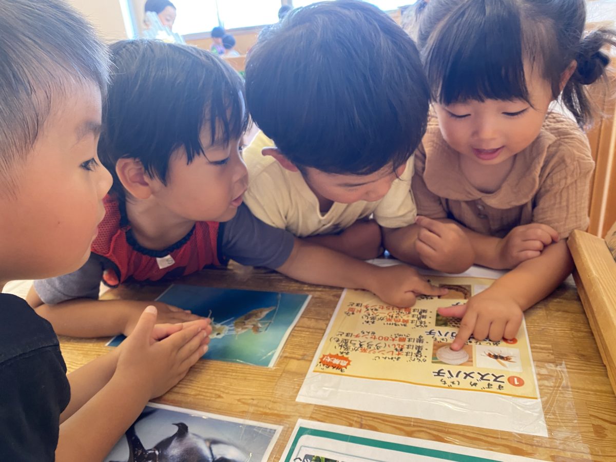 昨日興味を示して見ていたハチの資料から今日はハチの巣の資料を用意してみるとハチの巣を知っていたようで、「これ、はちのす!!」「はちのすー!?」と危険なことを感じながら興奮気味にお友だちと一緒に見ながら話していました。
