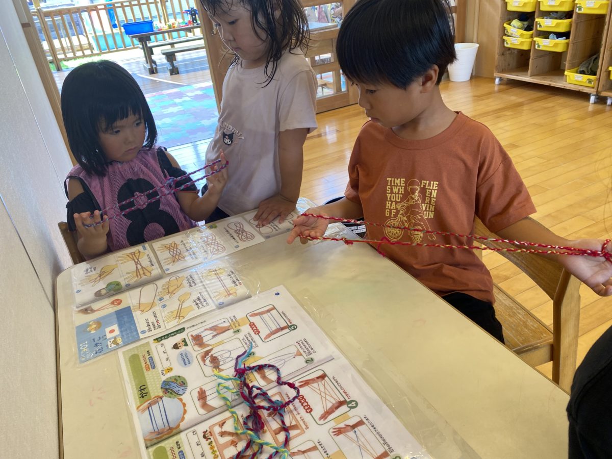 机にあやとりの資料を貼ってみると図をじっと見ながら、指を動かしてみる姿がありました。