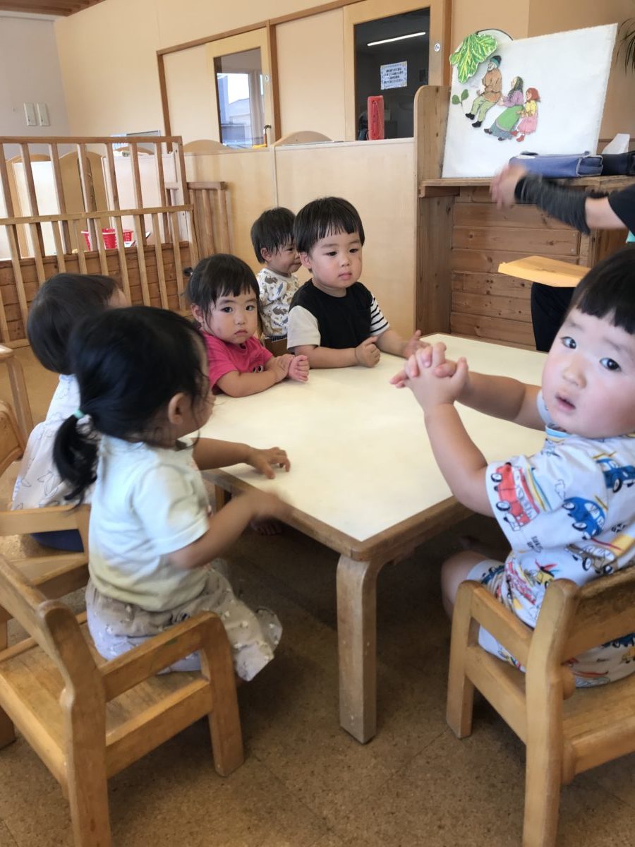 パネルシアター『おおきなカブ』では最初のうち「うんとこしょ、どっこいしょ!」の掛け声にあわせ一緒に動作をするのをためらっていた子もいたのですが、何回かその場面が出てくると皆が自信満々に手を動かし「うんとこしょ、どっこいしょ!」と一緒に楽しむ姿が。「ワンワンでてきた~」「ネコさん、バイバイ」と子ども達からの声も聞こえてくるなどパネルシアターを楽しむことができました。