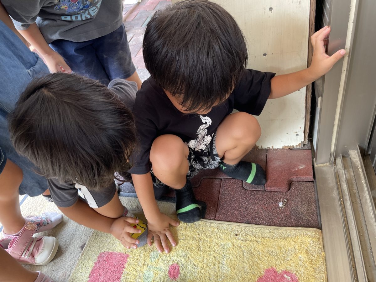 「この虫動かんけどいきとる?」と言いながらツンツンっと触って見たり、手のひらにのせて見たり触ったりしていると、ブブブっと動き出して驚いていました。
