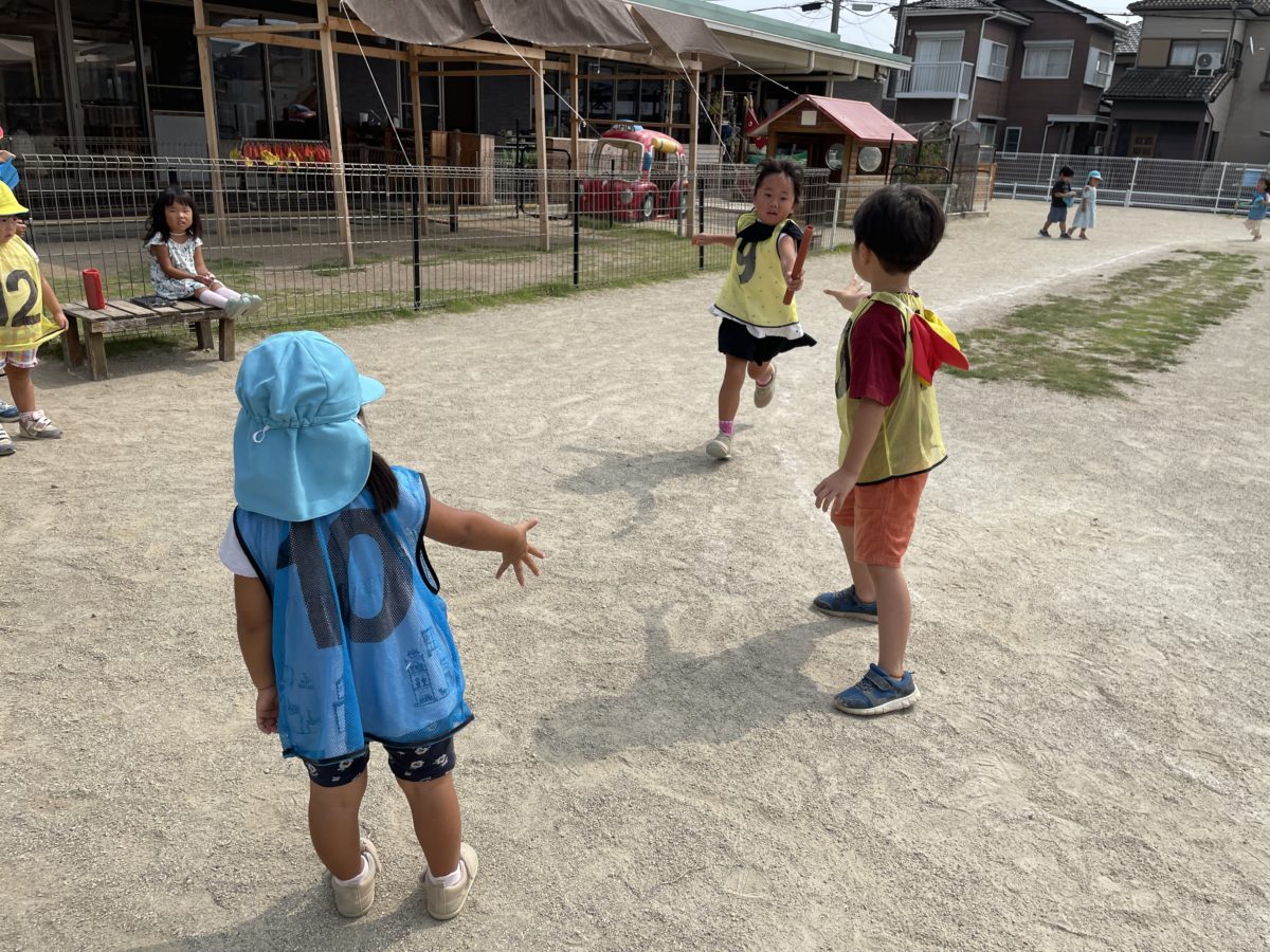 今日は園庭でのリレーが大盛り上がりでした!最初から接戦の勝負で、みんなが協力し合って勝負をしていました。特にめろん組のお友だちは『負けるもんか!』の気持ちが大きくて、応援にも熱が入り、と良い勝負でした。最後のアンカー勝負はゴールした時に顔を一つ分も無いくらいの僅差で、結果発表を聞くまでどっちが勝ったのか分からなかったのか、結果発表の時の反応もとても熱の入った感じで大盛り上がりでした。僅差で負けてしまったチームはとても悔しかったようで、「もう一回やりたい!」「もう一回やろう!」と言うので、もう一度リレーをすると今度は先ほど負けてしまったチームが勝ち、「引き分けやな~!」と楽しそうに話していましたよ!