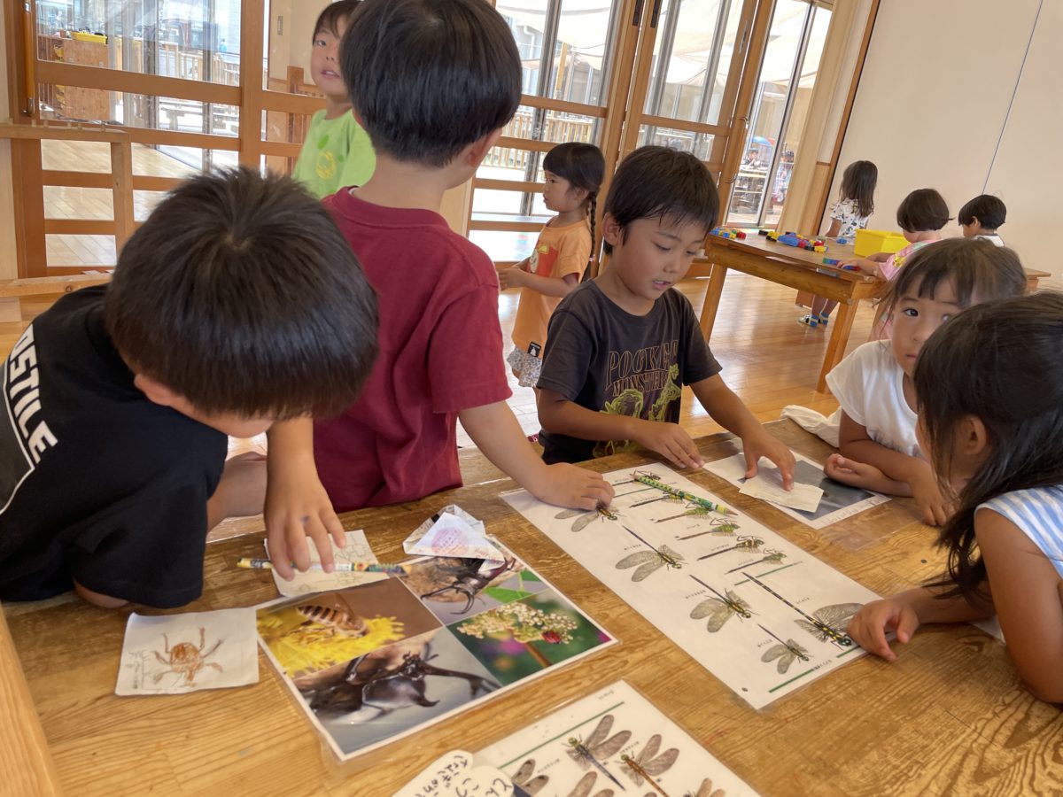 本日も虫で大盛り上がりの日だったようで、お部屋の中で虫が動かないでいるのを発見!「この虫動かんけど、生きてる?」「死んでないよな?」っと言いながらツンツンっと触ってみたりしながら観察しました。触られてビックリした虫は、ブブブっと体を震わせながら動きだし、「わあ!動いた動いた!」「良かった生きとったんや~!」と小さない生き物をいたわる気持ちが見られて、子ども達の成長を感じました。またお部屋では虫の写真も沢山飾ってあるので、その写真を見ながら羽の形の話をしたり、同じトンボでも色や形が全然ちがう話などで盛り上がってました。その観察の過程で虫を書いてみたいと話す子がいたので、観察をしながら紙に虫の絵を描いて楽しみました。細かい所までよく観察をしていて、足の本数を数えて描いていたりして見ているこちらが感心しました。色も細かく色鉛筆でつけたりしていたので、また飾っていきたいと思います。