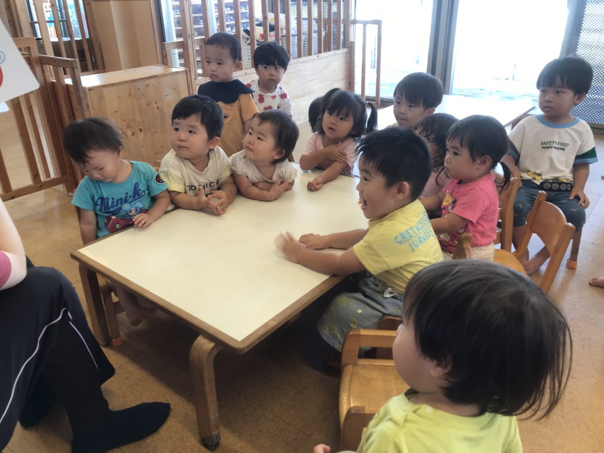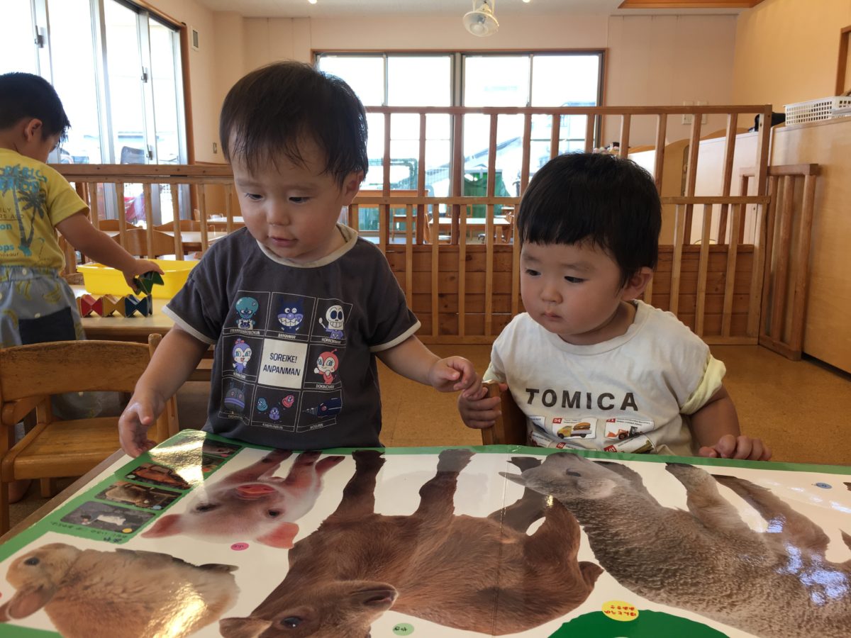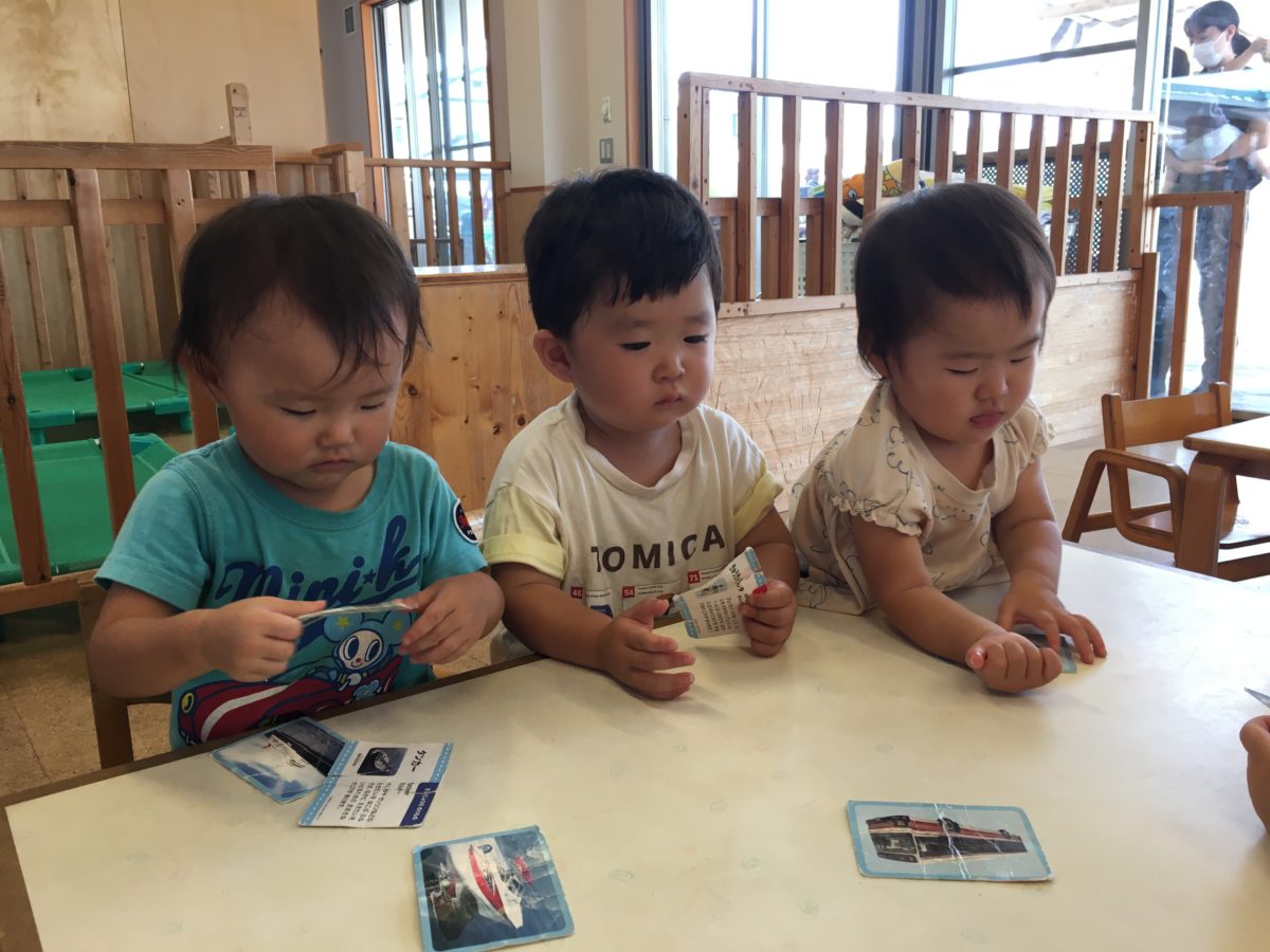 一方別の場所では、乗り物に興味を示し始めている様子。色々な働く車が出てくる絵本を読んでみると「キャリアカー!」「これタクシーだよ」と子どもたちは沢山の乗り物を知っています。そこで乗り物のカードを準備してみると皆大好きな乗り物に興味津々。中でも人気なのが救急車や消防車・パトカー。「これピーポーなの」とお友だちとカードを見せ合いながら乗り物カードを夢中になって見ていました。