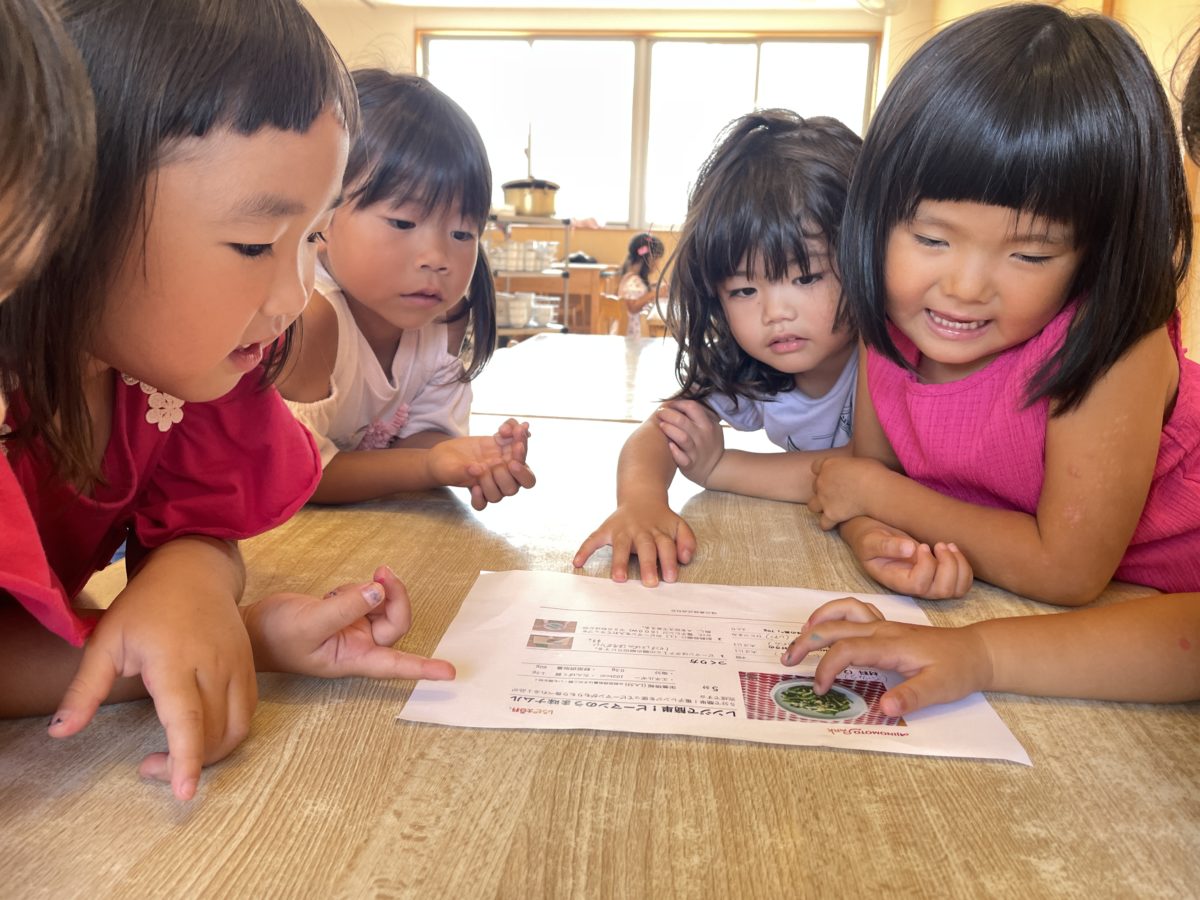 今日も朝からビブスを着てリレー対決!!以前はめろん組さんが走っていると負けてしまうから走りたくない…と話していた子も今は「まてー!!」と声に出しながらスタートを切るさくらんぼ組さん。一生懸命、前を走るめろん組さんを追いかける姿も見られました。そして畑に今日もたくさんのピーマンが実っているのを見つけました。先日クッキングしたのが楽しかったようで、「きょうもしゅうかくしたい!」とワクワクしながら話す子どもたちの姿があり、畑へ行ってピーマンを収穫!!「いっぱいとれた~!」と目を輝かせながら「くっきんぐしたいー!!」という声も上がりました。そこで午後からクッキング!!ピーマンのヘタを切ると見えてきたのは小さな種。「ピーマンってこんなにちいさいたね、たくさんあるの?」と驚きの様子もありました。切って加熱をしてもらい、味付けをして今日もおいしく頂くことが出来ました。保育室では、ブロックで作れる新しい図を用意ししてあるのを見つけ「みてー!これでパフェなんてつくれるんだって。」「こっちはレーシングカーってかいてある。」「こっちにはしろばいもある!!」と興味津々な様子で必要なブロックを数えて準備して組み立てる子どもたちの姿がありました。あっという間に「みてー!パフェできた!」とかわいい色合いで作ったパフェや乗り物を作り上げ、コレクションしている子どもたちの姿がありました。