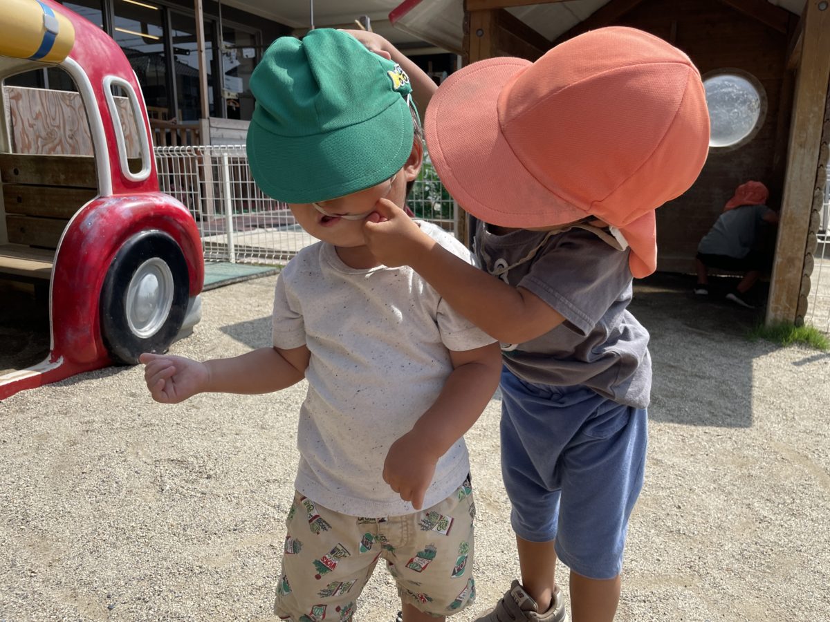 「帽子落ちとるよ~。」と拾ってあげた帽子をお友だちに被せてあげていました。
