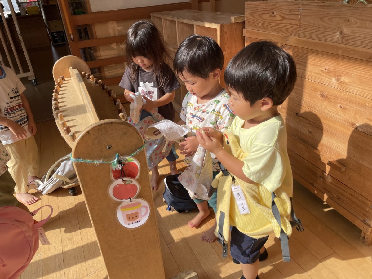 今日は戸外で沢山遊びました。赤い車に乗るとみんな必ずどこかに出かけたくなるようで、「ぶっぶー!のってください!出発しますよー!」と他のお友だちにも知らせていました。「隣すわってくださーい!」「パン屋に行きますよー!」と言うので、自分たちで車に乗り込み出発!『パン屋さんにおかいもの』の手遊びを歌うとノリノリで歌い、最後に「ちょこぱん2つくださいな!」の所で手を差し出すとポンッと手のひらにパンを乗せるフリをして大盛り上がりの子ども達でした。一方ではログハウスをエレベーターに見立てて遊んでいる子も居て、柱をエレベーターの階数を押すボタンがある場所にしているようで、「とびらしまります!気を付けてください!」「何階ですか?」「おもちゃがあるのはここですよ?」などなど自分たちで行きたい階数や行きたい場所を話しながら、エレベーターごっこを楽しんでいました。「ここでおります!」と誰かが言うと、ボタン係がスッと表れて、ボタンを押してくれたり、自分のタイミングで降りようとする子を見て、「おりますか?ちょっと待ってくださいね!」と言いながらまたいそいそとボタンの場所に向かっていたりして、ごっこ遊びなのにエレベーターに乗っているような気分が味わえる本格的なごっこ遊びでした。またエレベーターという面白い所に着眼点を持ってきて遊んでおり、お友だち同士会話から、エレベーターを利用したことがあるリアルな感じがとても面白いなと思いました。またお部屋でもエレベーターについての写真や資料を用意したいと思います。