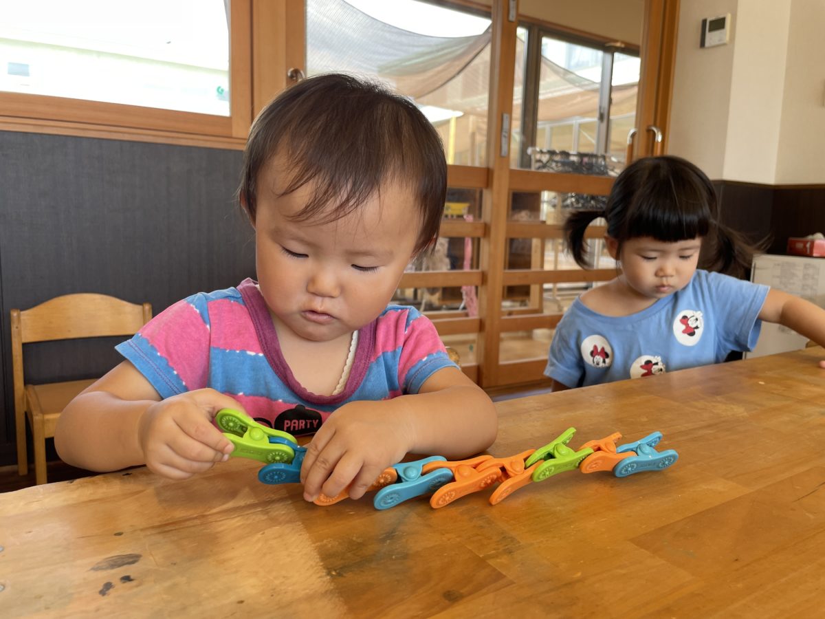 小さい子はお大きい子のしていることを本当によく見ています。大きい子が集中して座って遊んでいると、集中して遊ぶ姿があり、シール貼りをしたり、クリップの玩具を長く長く繋げたりしたりして、楽しそうに遊ぶ姿がありましたよ。