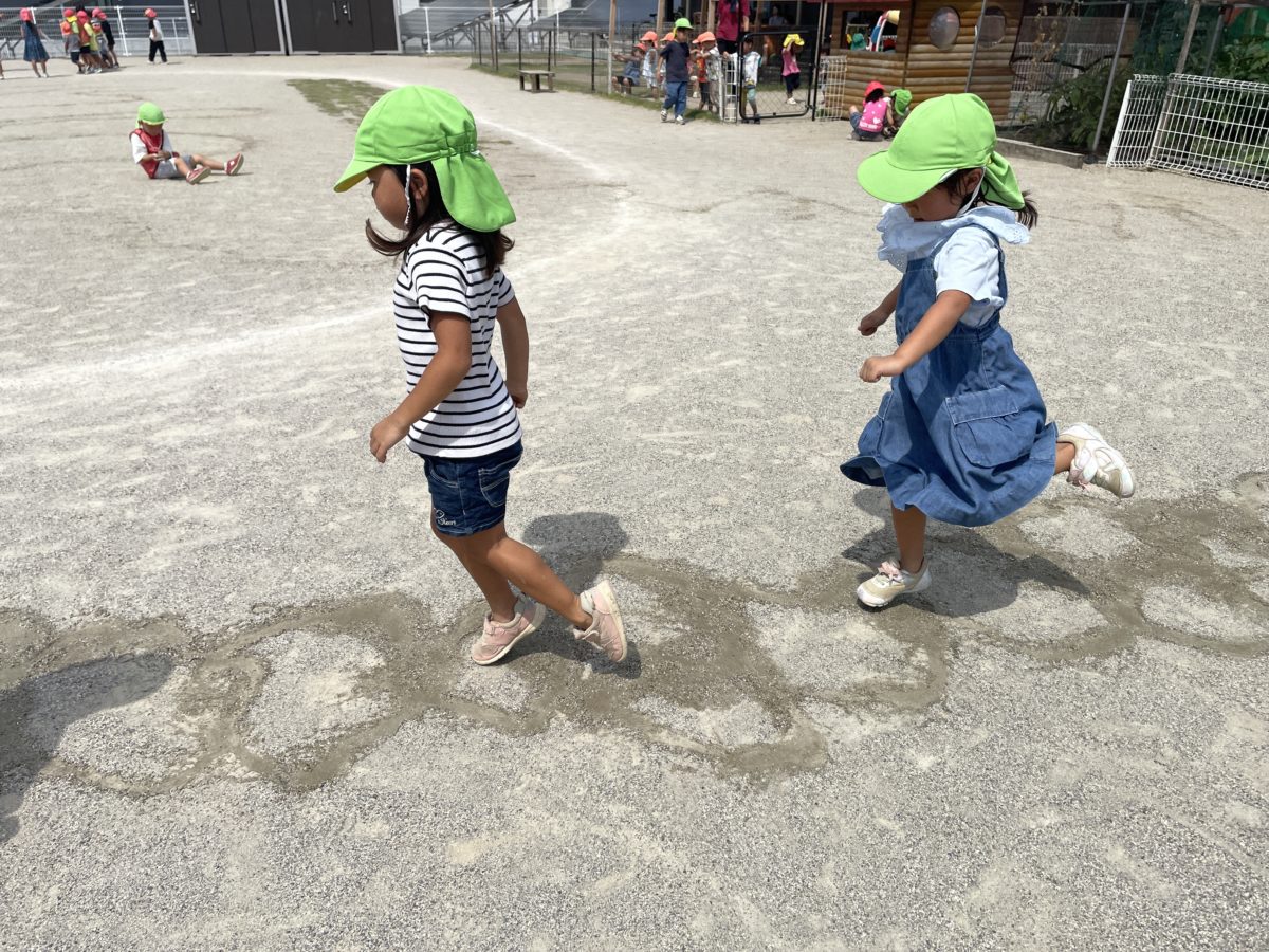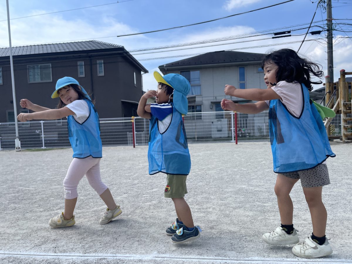 園庭でダンスをしていると途中から運動会のダンスのように踊りながら前へどんどん行進していく子どもたち。「わたしもできるー!」とさくらんぼ組のお友だちもばなな組やめろん組さんの真似をして元気に踊りながら進む姿がありました。「きょうは、にんたまおどりたい!」「ぽけもんがいい!!」と子どもたちが踊りたい曲を何曲か流してみんなでダンスを楽しみました♪