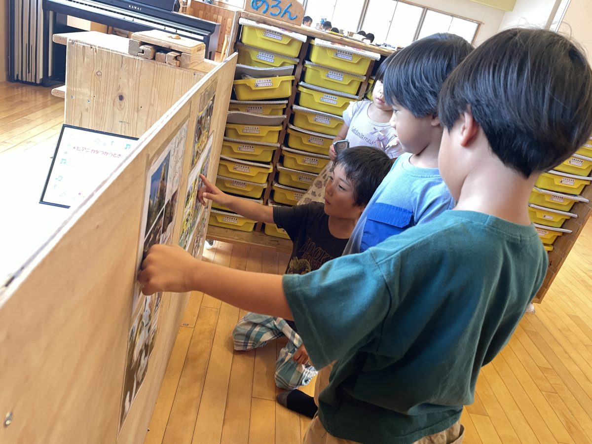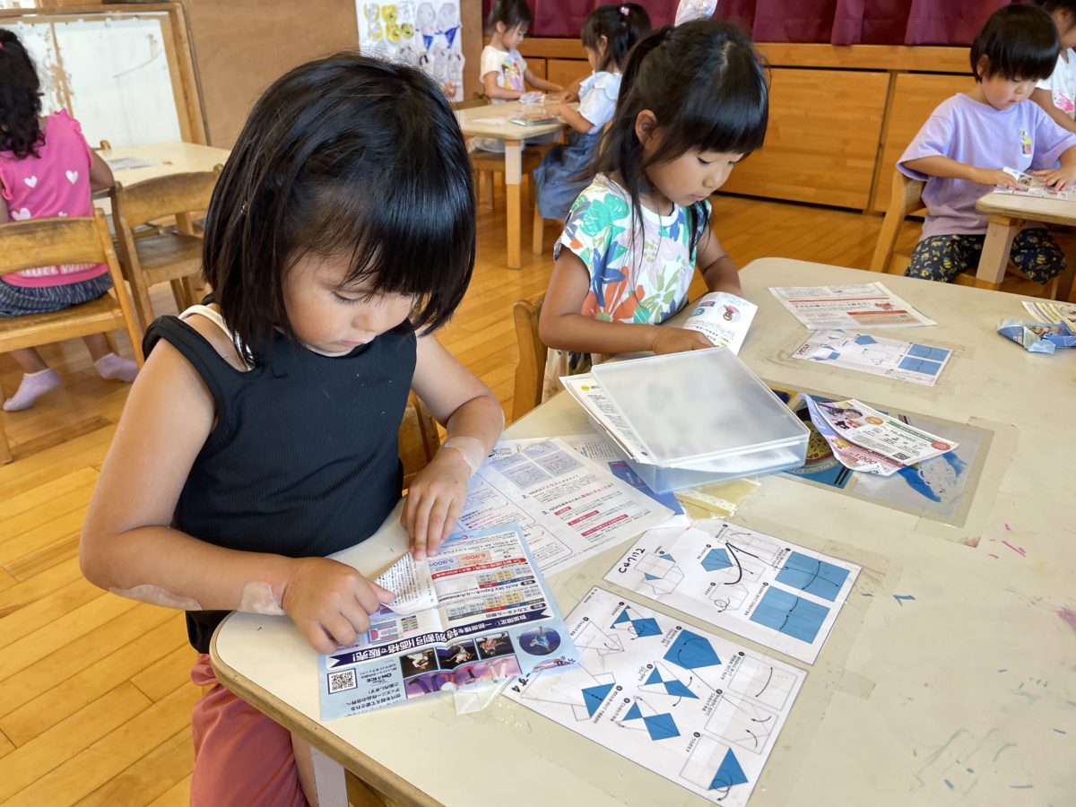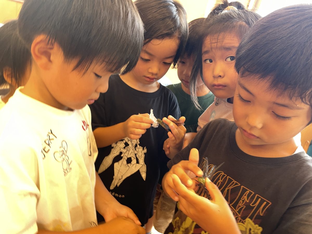 中庭に、大きなギンヤンマが跳んできました。そしてそのギンヤンマをすかさず捕まえ「よっしゃー!ぎんやんまつかまえれた!!」と子どもたちは大喜び!以前トンボの種類の写真を見た際にお腹の部分がオスは水色になっているのを知ったこともあり「このぎんやんまはオス!!」と捕まえてお腹の部分を見て判断する子どもたち。「ぼくもさわりたい!」とトンボの持ち方をお友だちから教えてもらいながら「こう?これであってる?」と初めて持つトンボに少しドキドキしていて、トンボが足を動かすと「うわ!こわいー」と急に動いたトンボに少し驚いている子もいました。すると「みてートンボのめ」「めっちゃおおきいし、きらっきらしてるの!」「ほんとうや、ほうせきみたい。」とキラキラしているトンボの目に興味津々でした。またばなな組のお友だちは「おりがみでひさしぶりにようふくおりたいな。」と以前折り紙で折ったTシャツやワンピースの折り方を思い出しながら作り始めた子どもたち。「できたからつぎはいろぬろうかな。ハートいっぱいにしようかな?どっちにしようかな~」とイメージを頭の中でわかせながら1つずつ大切に仕上げていく姿がありました。