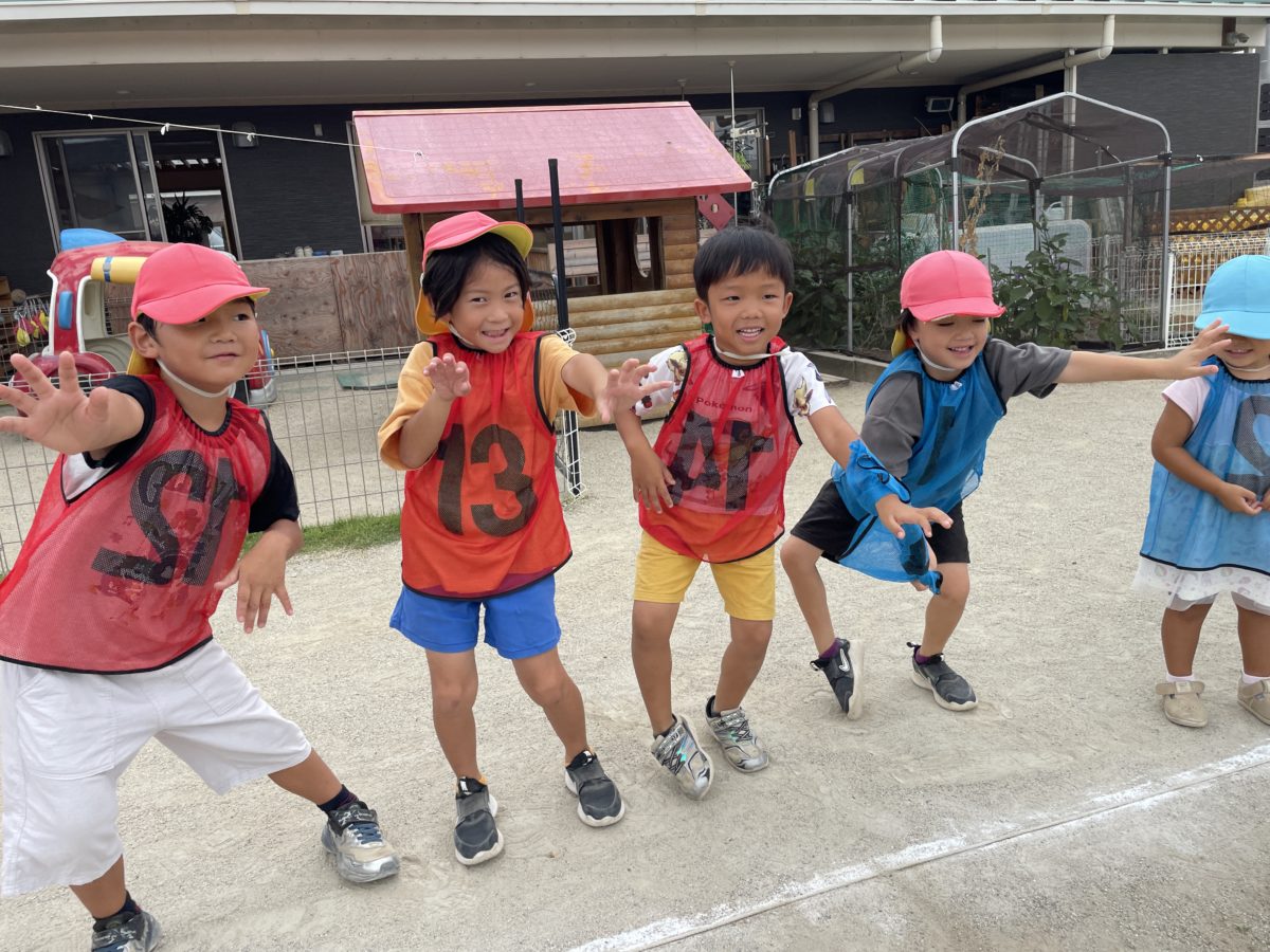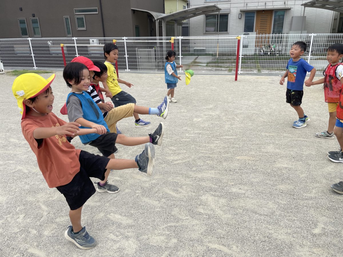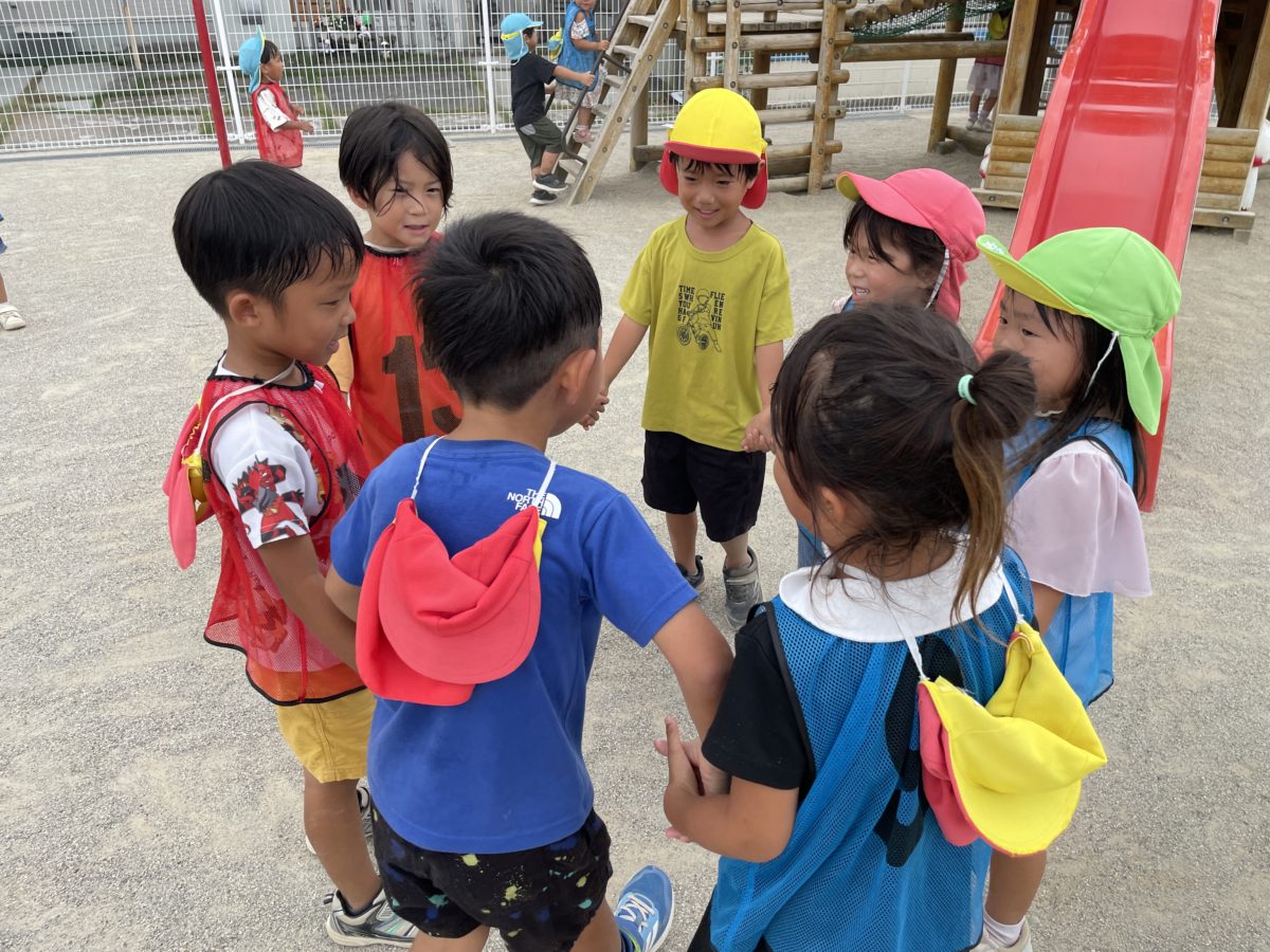 今日はどんより曇り空ではありましたが、風もあり過ごしやすい気候でした。子ども達もそれを肌で感じているようで、いつもは室内で過ごしているお友だちも、今日は戸外に出てきて遊ぶ姿がありました。「なんか面白い遊び知らん?」「鬼ごっこ?」「鬼ごっこはいつもやってるやん!」「えー。他には分からん!」と言うので、新しい遊びを提案。昨年もやったことのある子は覚えていたようで、「はないちもんめ知ってる!」「やろやろー!」「半分にチーム別れやな!」と言いながら素早く二つに分かれ、「歌分からん!」「俺知っとるで一緒に覚えよう!」と言いながら知っている子が歌い始め、知らない子はそれに合わせていき、数回するとみんなで楽しそうに歌いながらはないちもんめを楽しんでいました。“相談しましょう~そうしましょう~!”の後にみんなで円陣を組んで相談していたのですが、だれを指名するのかどうするのかの相談をする後ろ姿がワクワクした感じが伝わり、とっても可愛らしかったです。