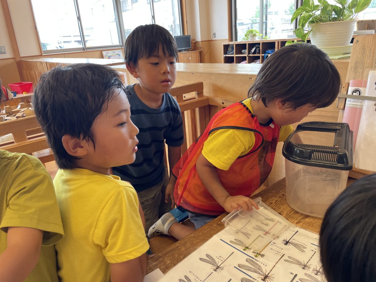 虫ムシブームの子ども達は今日も虫を見つけると大興奮!「網貸してください!」と虫を見つけるたびに、虫取り網を手に捕まえに走っています。トンボを捕まえるとお部屋にある虫のコーナに持っていき、図鑑や資料と見らめっこ。実際のトンボと図鑑でどこが違うのかや、種類はこれで・・・っと話しながら今日も虫の観察にいそしんでいます。
