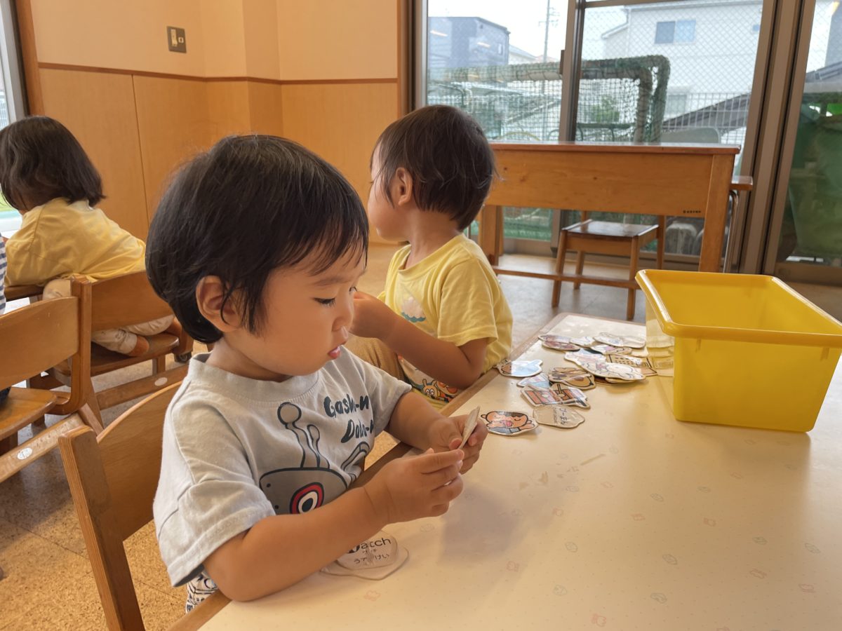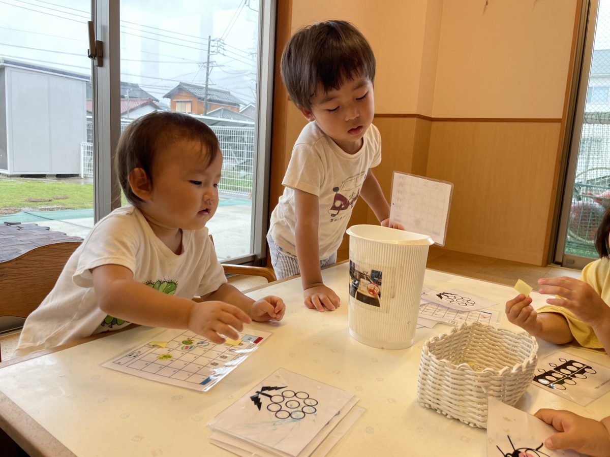 お部屋で過ごすのに様々な玩具を用意し、子ども達が自分で選んで遊んでいけるようにしています。今日はシール貼りが大人気!みんなが交代で楽しみました。おたより帳のシール貼りと同じカレンダーの台紙を用意しておくと、普段カレンダーに貼っているお友だちがカレンダーのマスに合わせて1マス1枚のシールを貼っていき上から順番に貼っていくお友だちも居れば、好きな所から貼っていき、全部のマスを埋める子も居て、シール貼りを楽しみました。