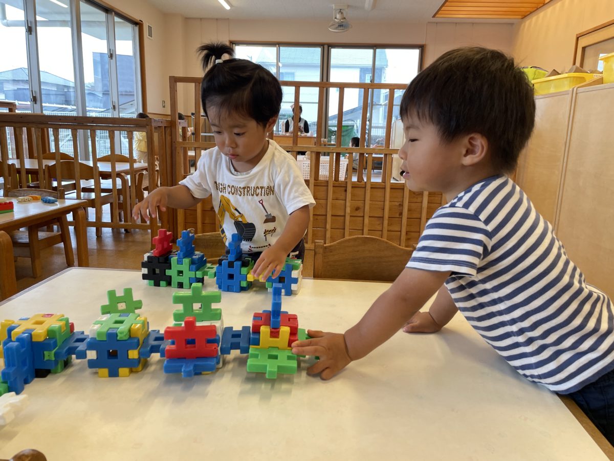 今日は雨が降っており、窓の外で振る雨を窓越しに見る子ども達。「雨降ってるね~。」「いっぱいだね~。」と話しながら雨が降り続けるのを眺めていました。そんないちご組の子ども達。お部屋で積み木を積んで遊んでいる時も保育士が少し高めに積み木を積み上げると、「これはあぶないね~。あぶないからね~。」と高くなった積み木を低くする場面があり、低い高いが分かっている事にとても驚きました。子ども達の日々の成長に驚きです。