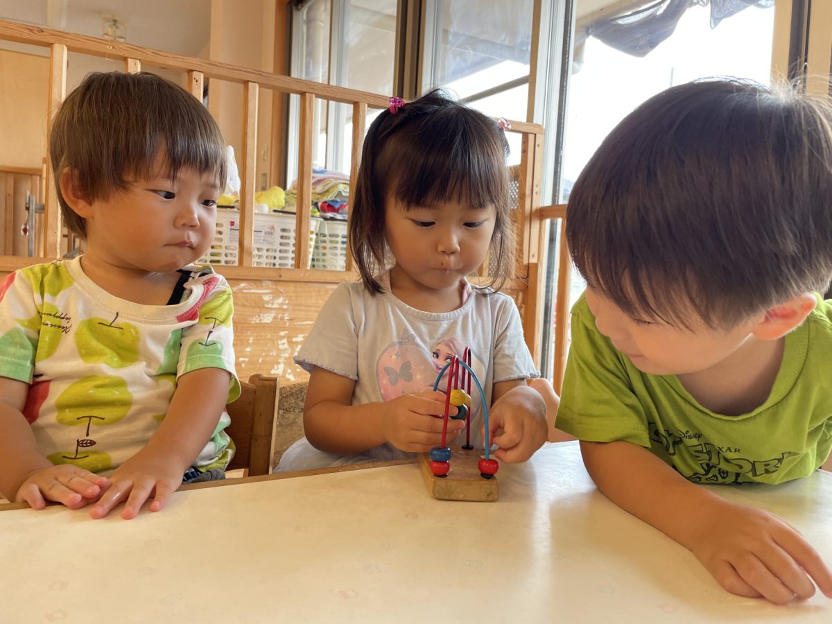 球を動かす玩具に興味津々。「これは赤やで~!」と色を言いながら動かしてました。