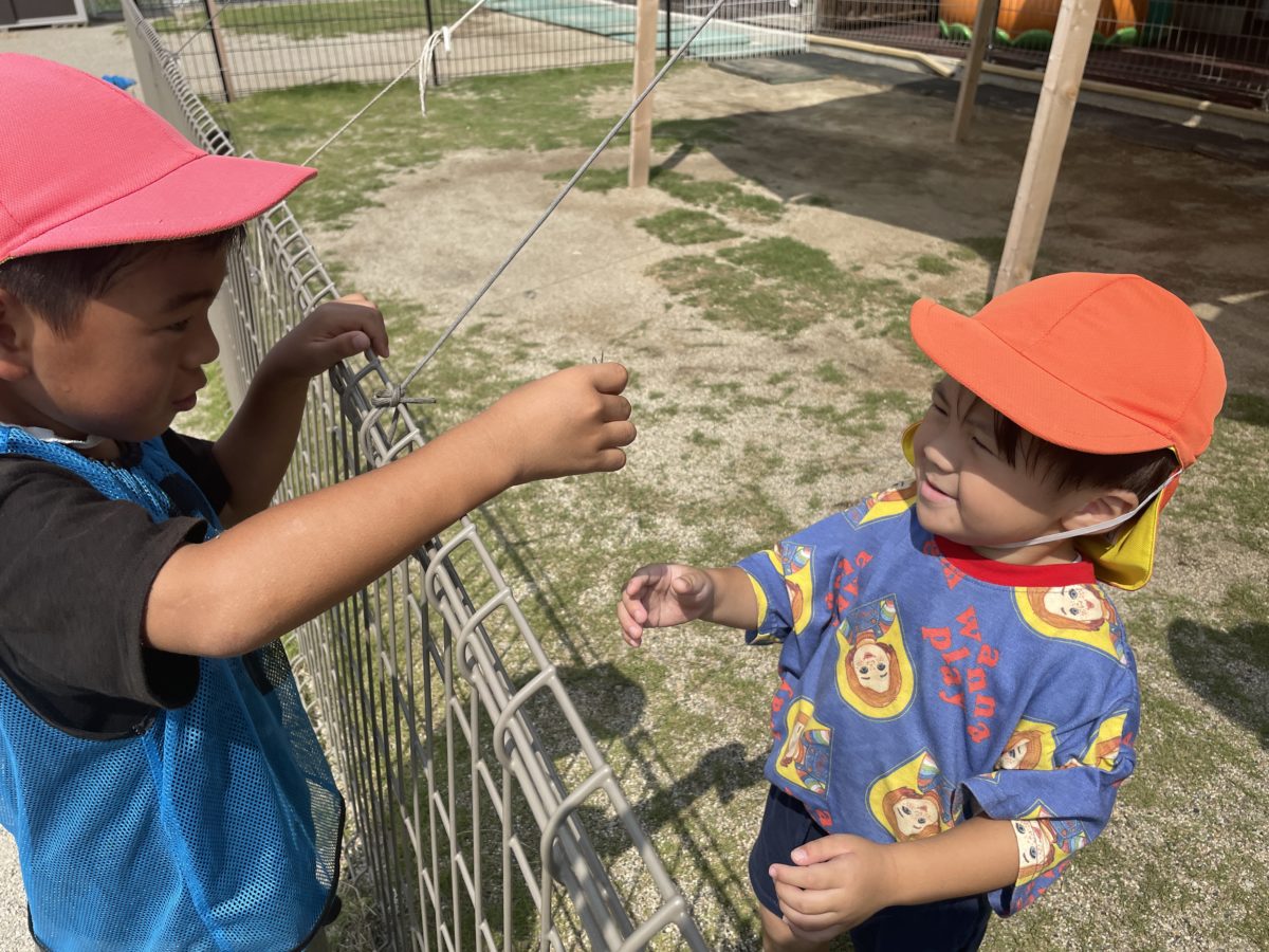 園庭では、 大きいクラスのお兄ちゃんお姉ちゃんの様子を見ながら声をかけてもらったりする姿が多く見られました。トンボを取っている姿を見て声をかけると「みせたろかー?」と、見せてもらったり・・・