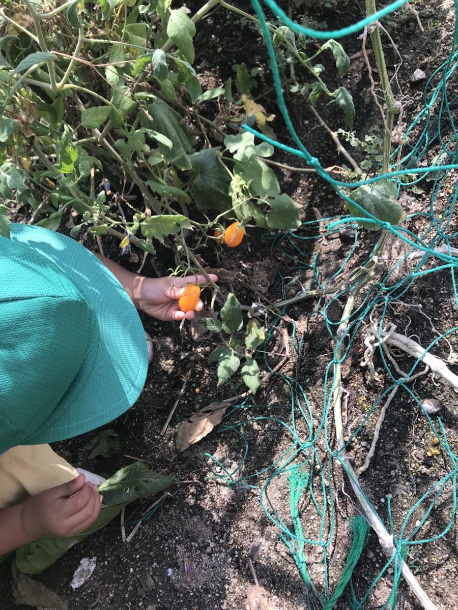 大きいクラスのお友だちが畑でナスを収穫しているのを見て、「とまとある?」と、一緒に探しに行きました。黄色いトマトを見つけると、「これだべれる?」と、収穫して手洗い場にまっしぐら! ちょっとヒビ割れていて、食べれなさそうでしたので「ざんねんだねぇ・・・」と言うと、本当に残念そうに「ざんねんだねぇ・・・」と言っていました。お楽しみは次の機会ですね。