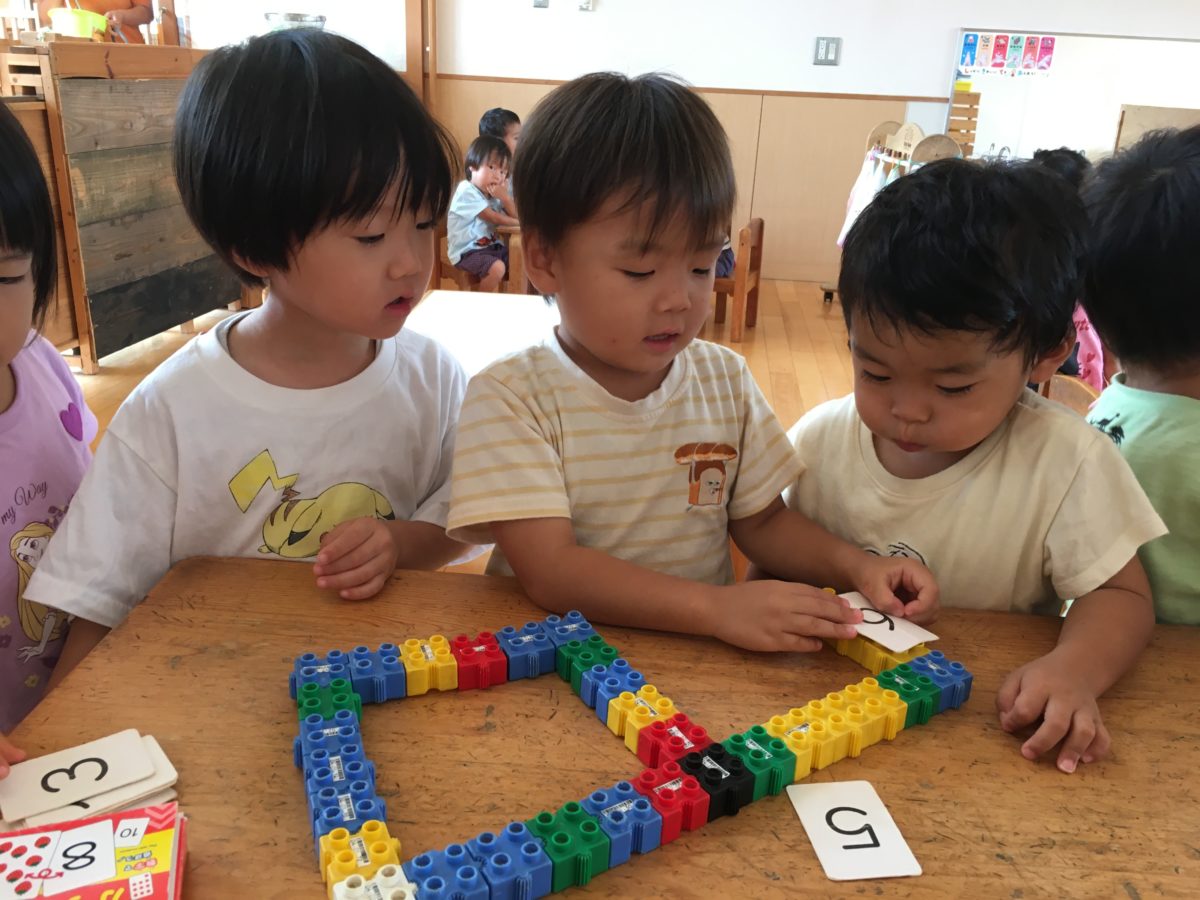 数字のカードを見ながら、ブロックで何をしているのかな・・・?と見ていると、ブロックを組み立てて同じ形を作ろうとしていました。同じになったかな?