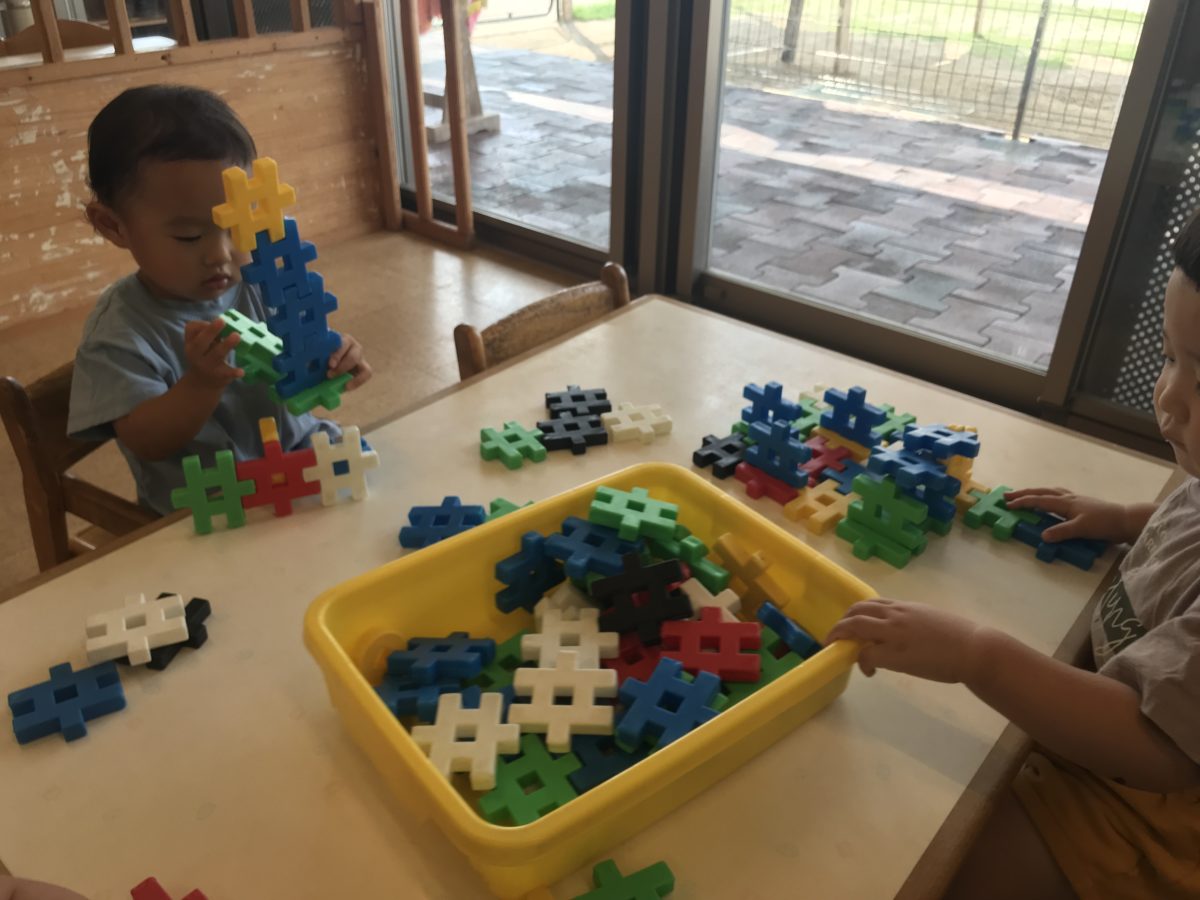 お部屋ではブロックを使って思い思いの物を作って遊んだり、カードなど見たものを作ってみようとしてみたり、それぞれが考えて作ることを楽しんでいました。