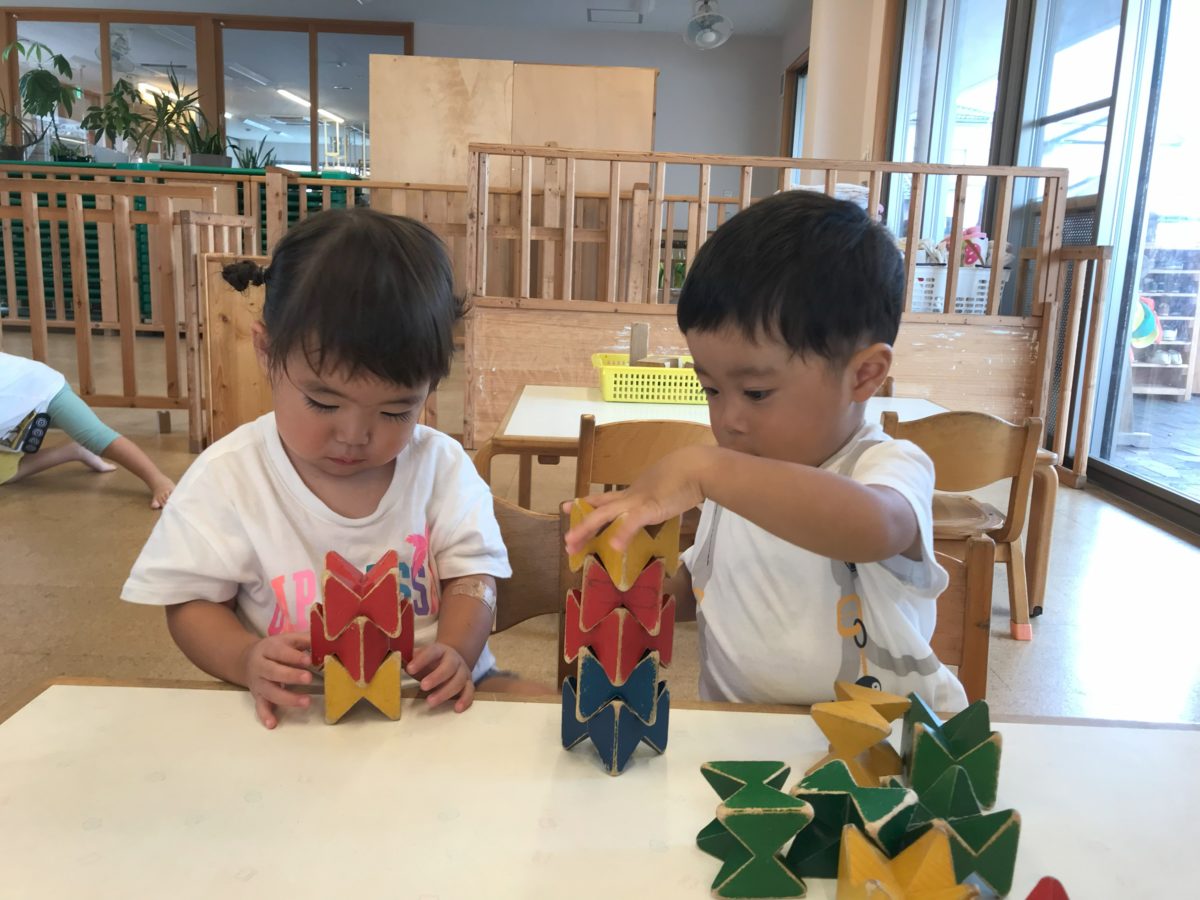 積み木を高く積もうと慎重に積んでいました。最後は二つのタワーを一つにしようと協力している姿がありました。