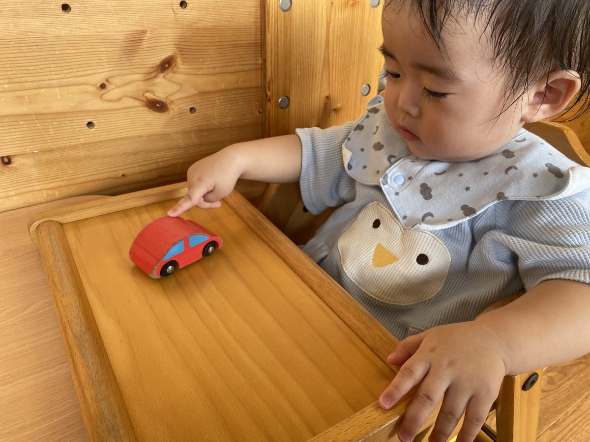 すいか組さんは車のおもちゃを机の上でコロコロ走らせていました。指先を上手に使って車を行ったり来たりさせて何度も走らせて楽しんでいました。