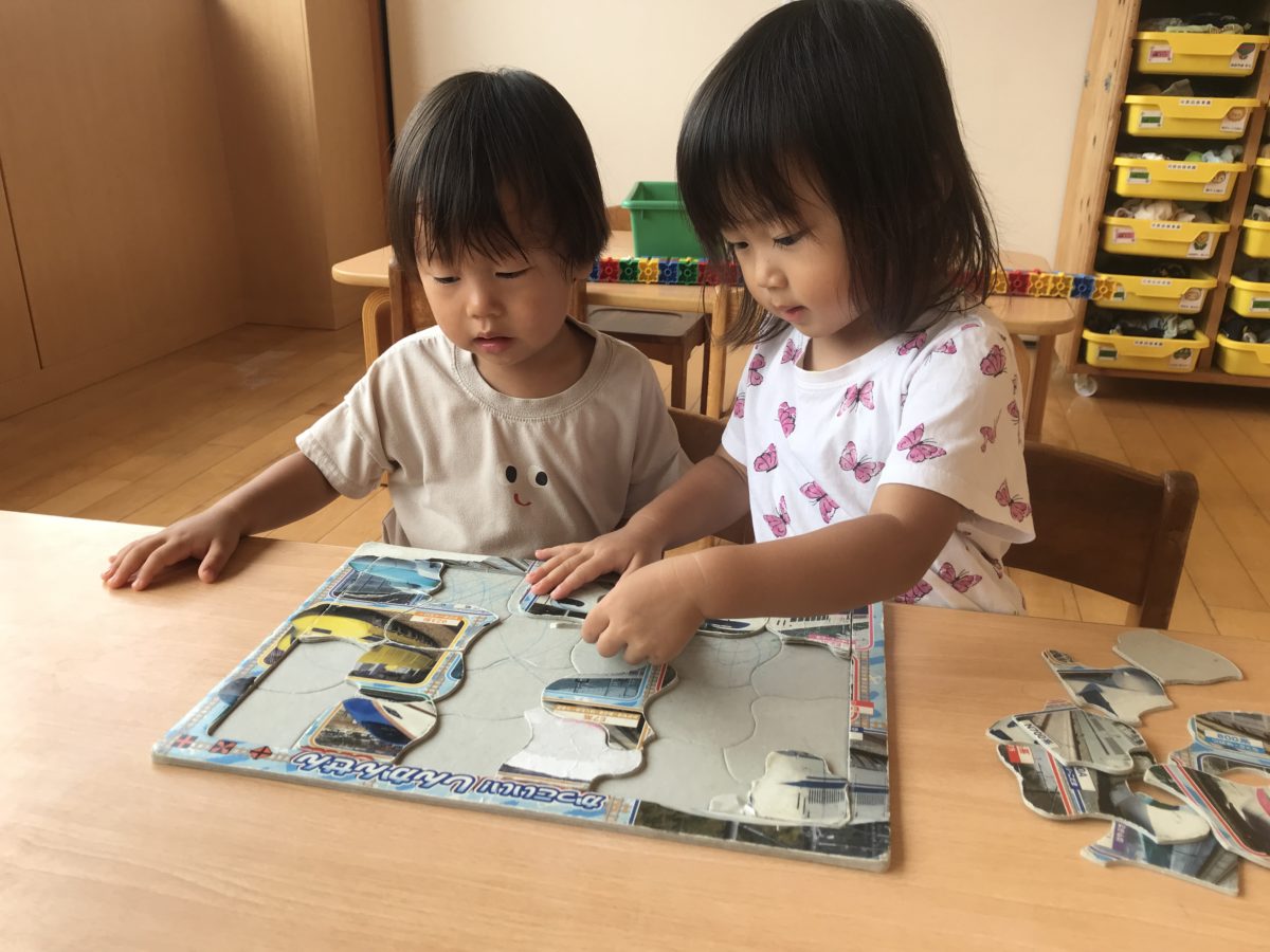 「ここに置くんやで!」「これかな~?」新幹線の少し難しいパズルをお友だちと一緒に完成させていました。
