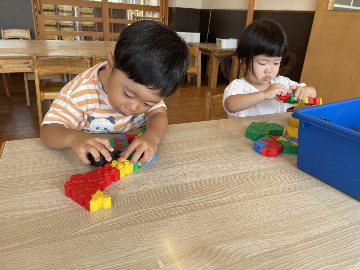 玩具を繋げて遊んでいました。どれぐらい長く繋げらえるかな?