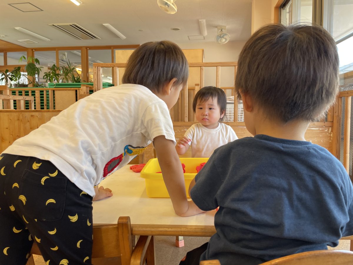 今日はとても素敵な一面が見られました。いちご組のお友だち同士が、玩具の取り合いで喧嘩をしていた所、りんご組のお友だちが仲裁に入る姿がありました。玩具の箱を掴み泣きながらの取り合いをしていた所を、「アカンよー!」と言いながら仲裁に入り、「喧嘩はだめよー!ね?」と優しく諭すように話しかけており、いちご組のお友だち二人も納得がいったのか、最後は穏やかな顔になり、一緒に玩具を使って遊ぶ姿もありました。りんご組のお友だちに優しく仲裁に入ってもらい、納得がいったようでその後も二人で仲良く遊んでいました。